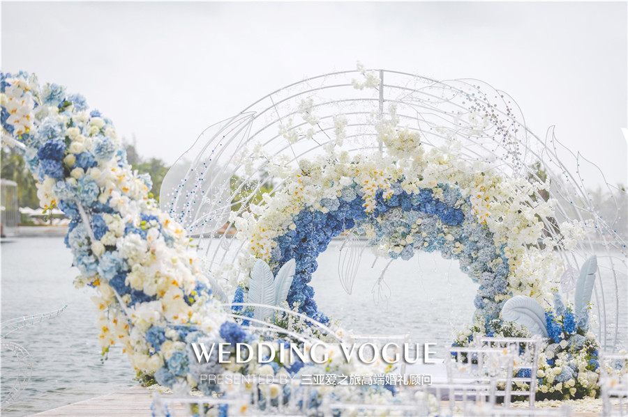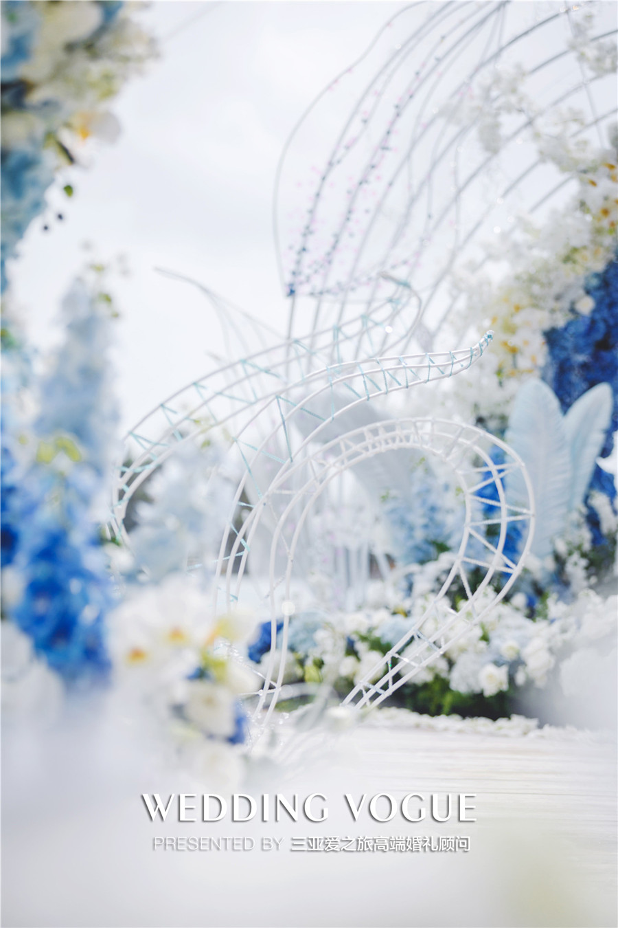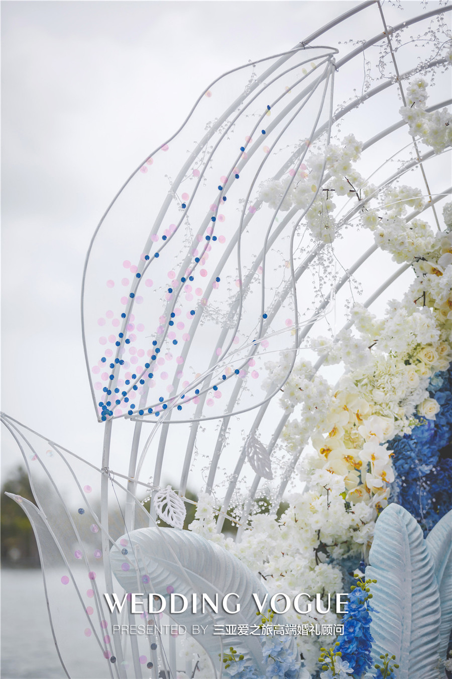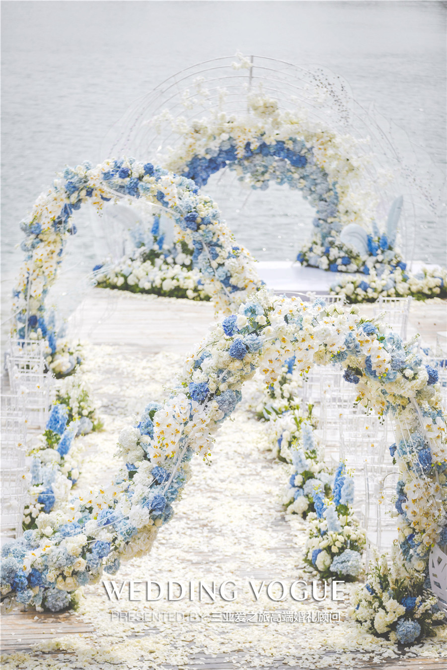 在整体的布置上,选用了清新纯粹的蓝白色为主色调。透明的水晶材质、通透的蓝色,凸显纯粹质感,装饰白色的蝴蝶兰、玫瑰、蓝色的绣球,鲜花点缀,唯美而又浪漫。
