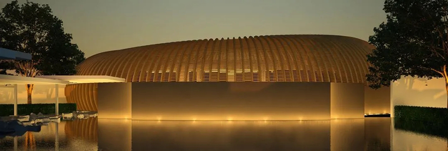 场地类型:酒店大堂,呈圆环状,地上池面的水通过水循环系统上升至“天穹”,再垂落行程“水幕”,