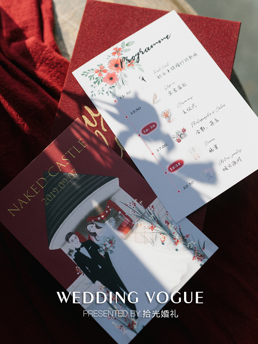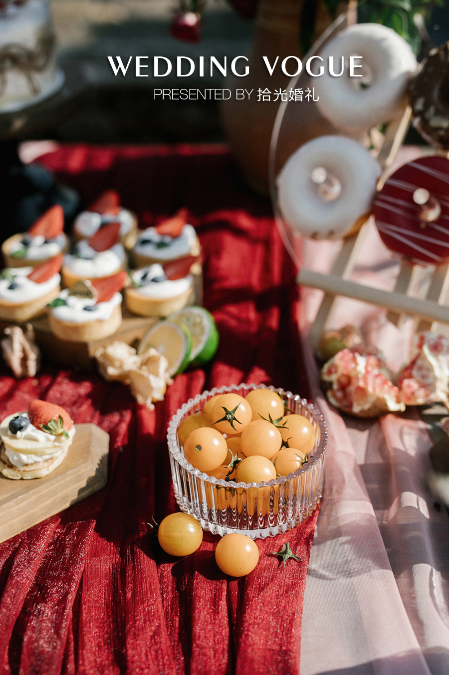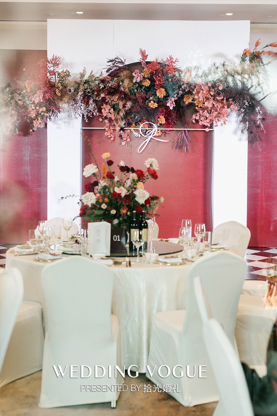 小谷不喜欢太复杂的东西,喜欢偏酒红色橙色系的暖色调,所以我们把勃艮第酒红作为婚礼设计的主色调,点缀橙色。