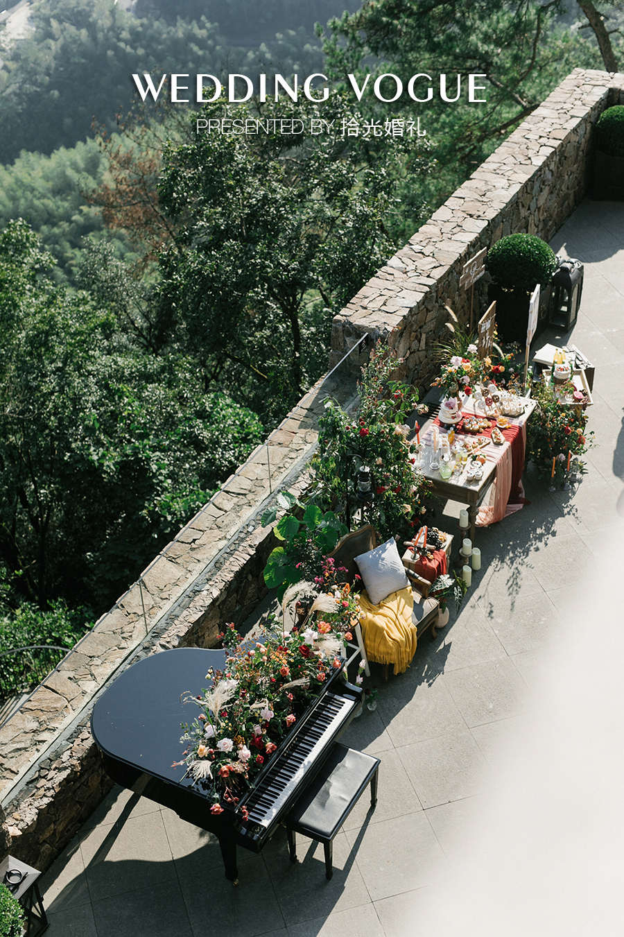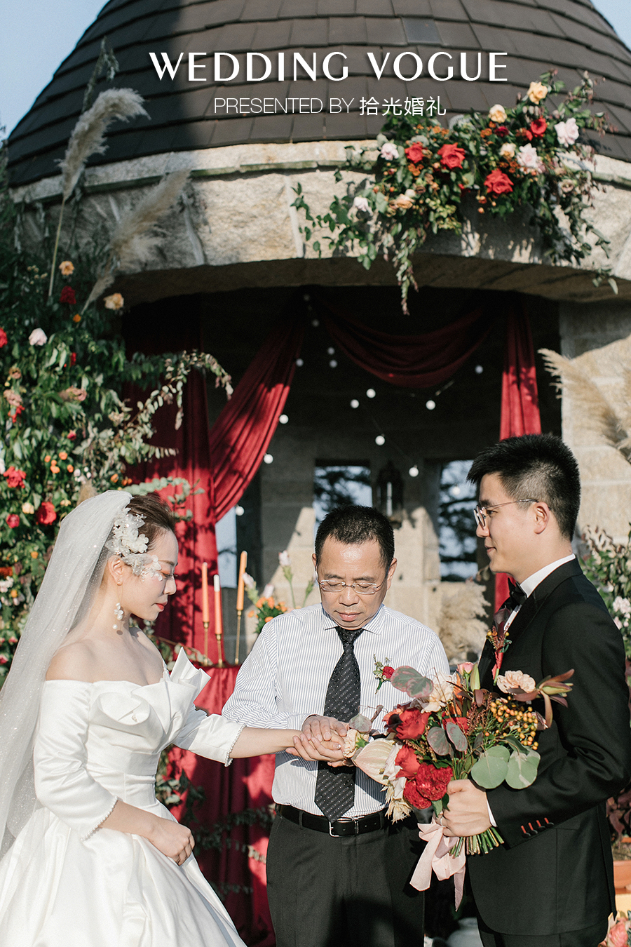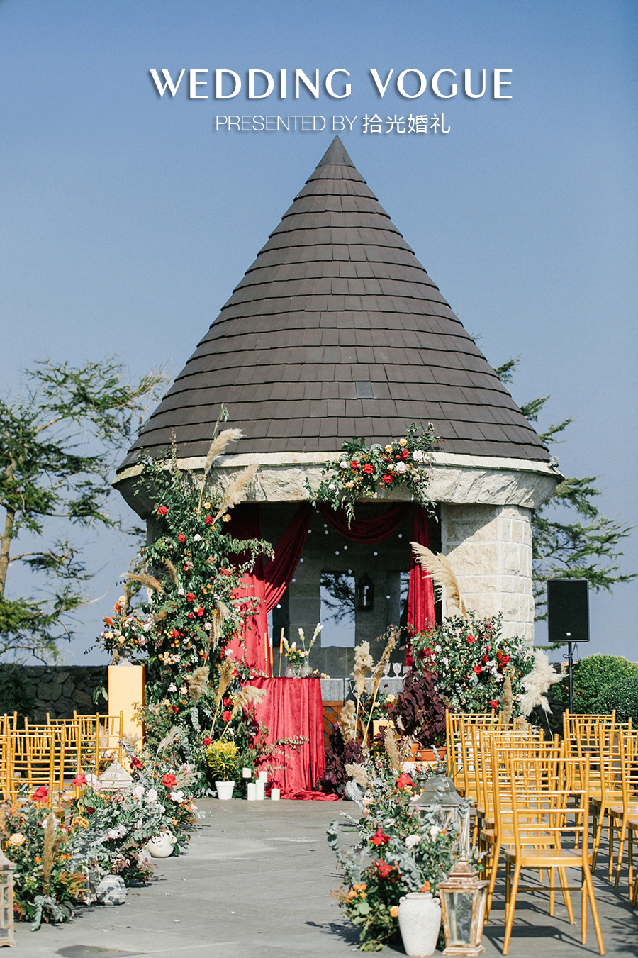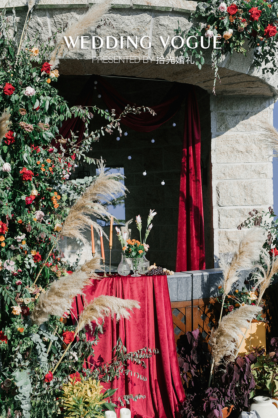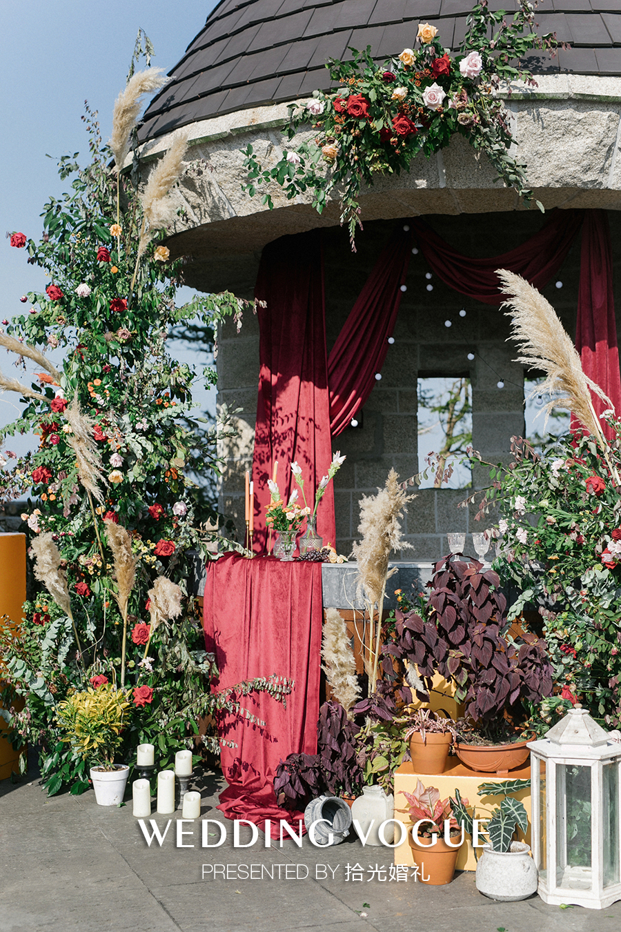 裸心堡二楼户外的小城堡建筑作为婚礼仪式背景,结合勃艮第酒红帷幔跟花艺装饰。