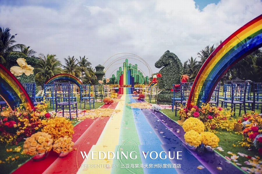 有一种爱情叫命中注定,当初一瞥,就此注定终生。婚礼背景的绚烂彩虹,七彩渐变花艺美不胜收,象征着彼此七年如此缤纷的爱情时光,并且未来的日子也定将更加绚丽,紧握双手,让爱绽放在这片梦境里。