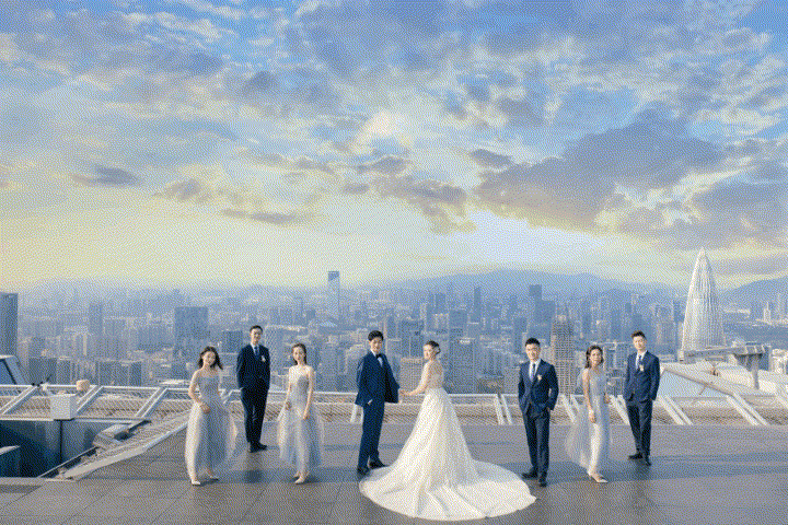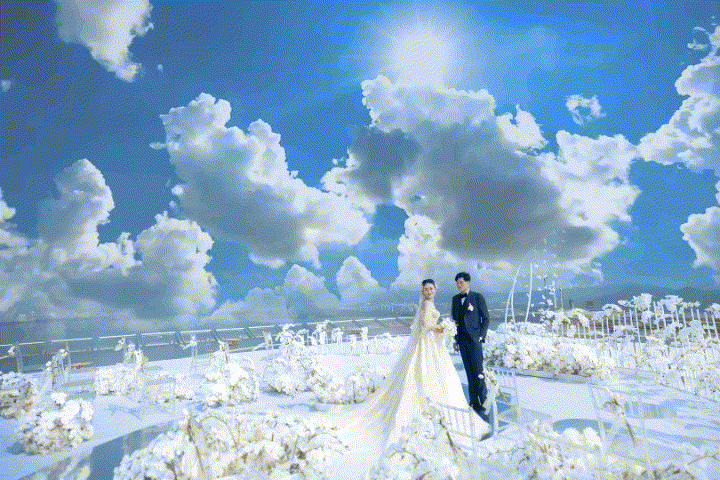 顶上婚礼,为爱相遇,伸手可触天空,云天逐风下美好的誓言正在发生。