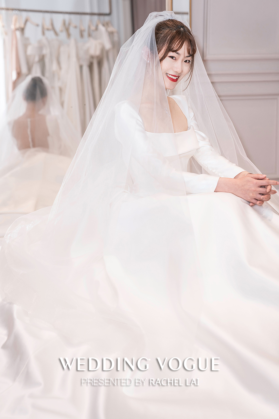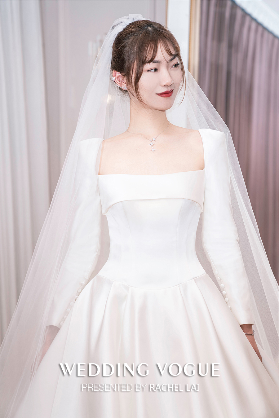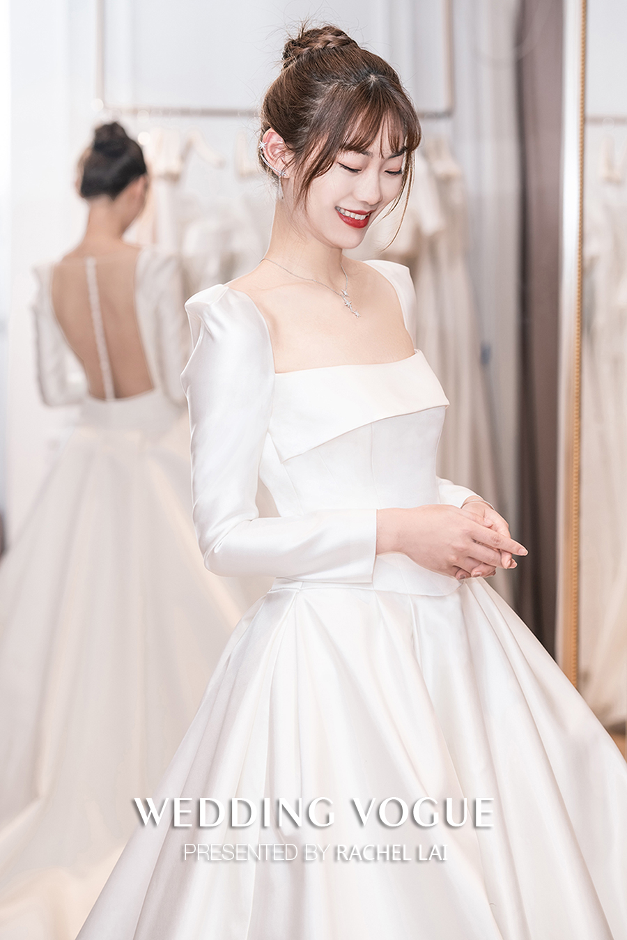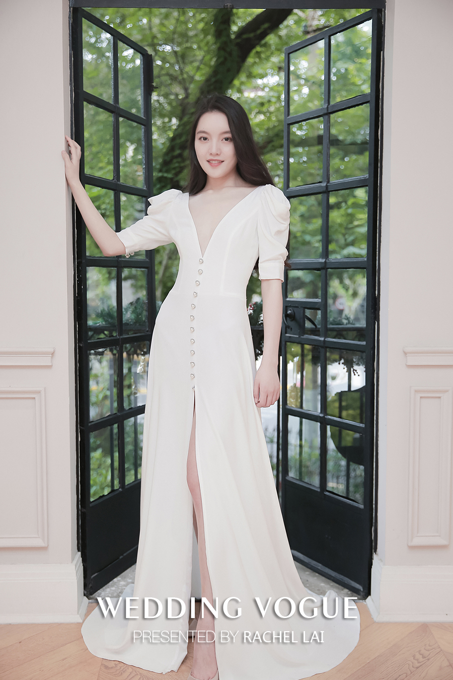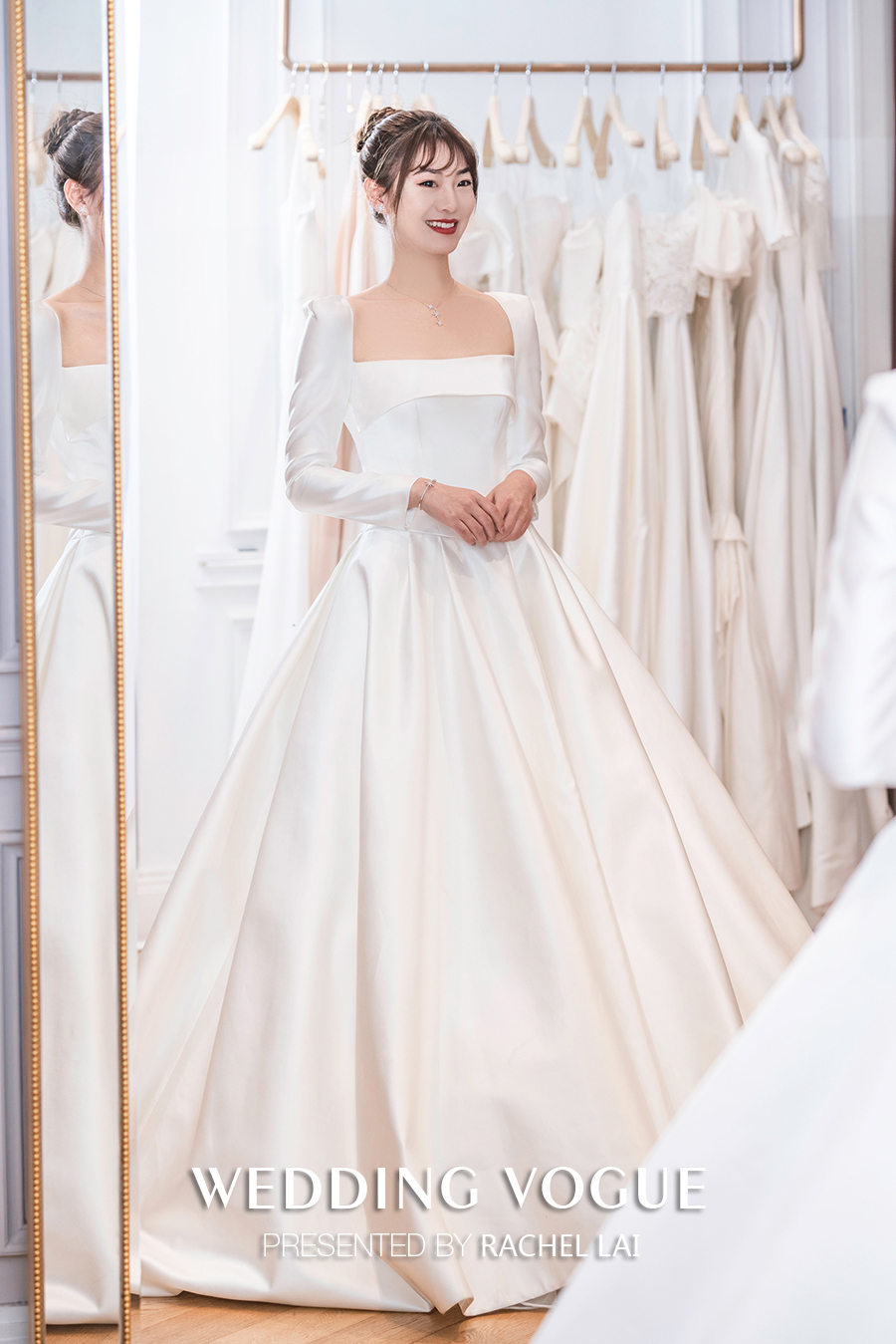这件也是设计师Rachel自己婚礼的迎宾纱。特别受欢迎的一款婚纱。微微有点鱼尾廓形的礼服婚纱,适合不同的体型。