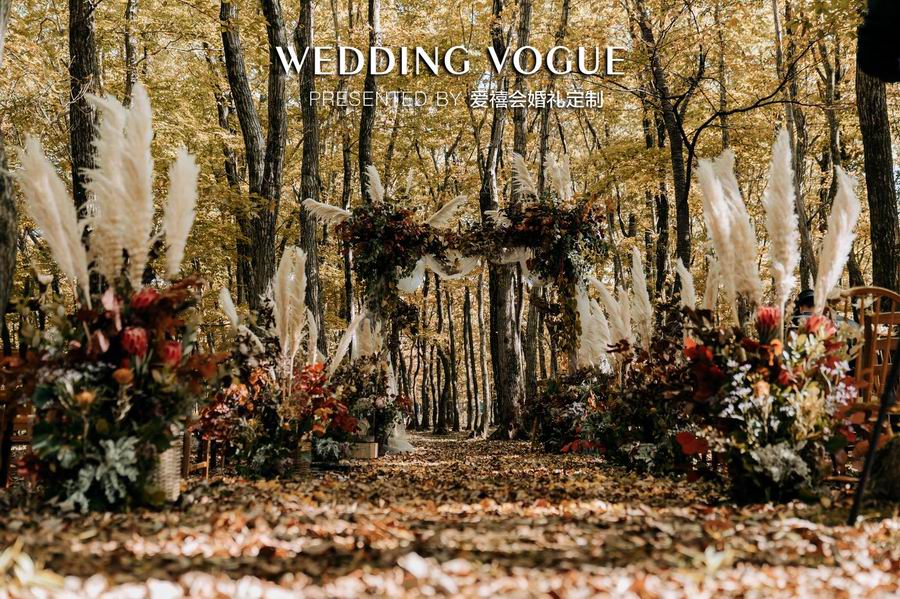 在秋季的日本那须,借由天然的户外环境,用大面积落叶作铺垫,32张各不相同的复古椅子,从森林之中获取的花材、木头、篮子,装点了整个户外仪式区。