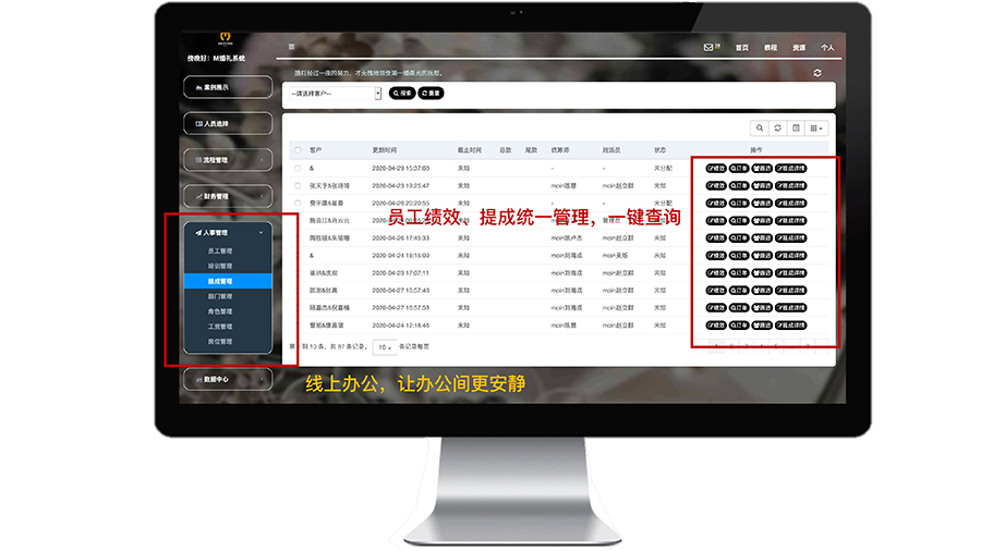 员工管理、标准化培训体系、提成管理、部门管理、岗位管理、薪资管理,
