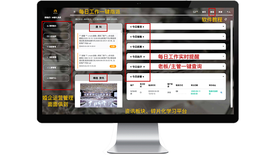 打造婚企强大标准化、自动化婚企内训体系。随时随地跟踪员工各项工作及员工进步实况。