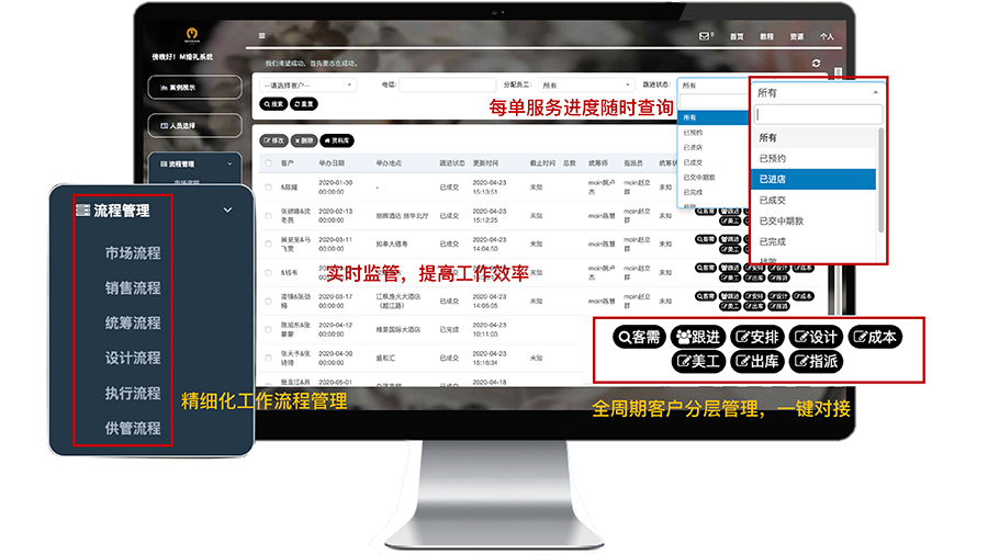 客户服务流程全景视图,订单一键指派,新人需求同步录入,各服务部门共享,告别重复开会对接,工作效率大大提升。