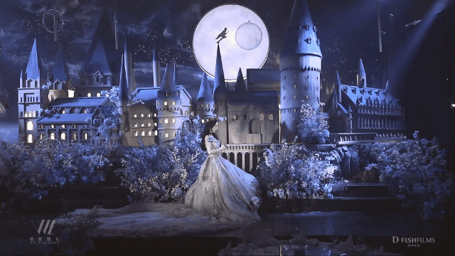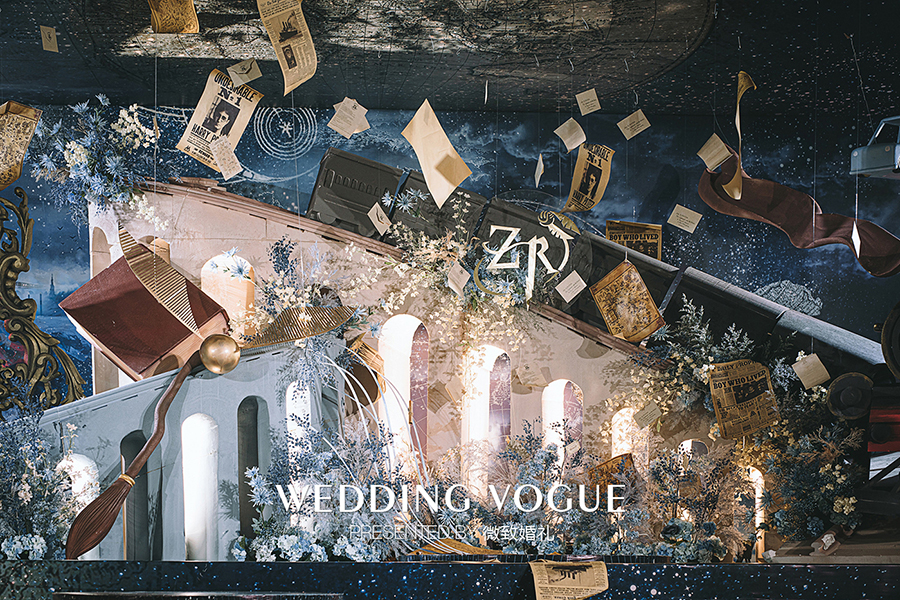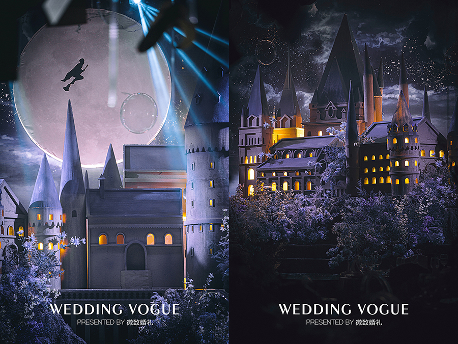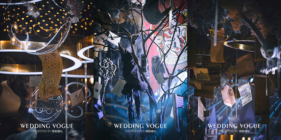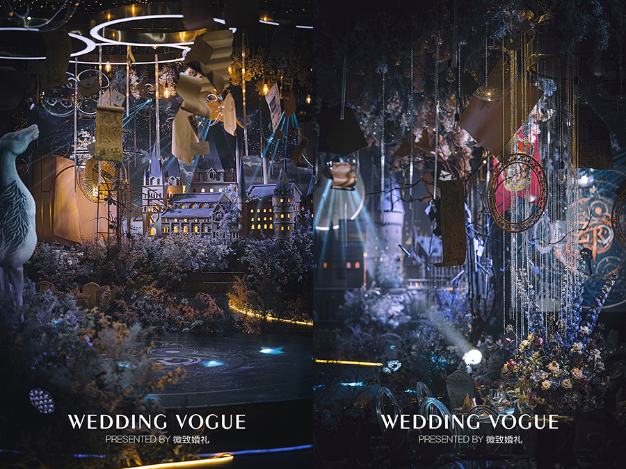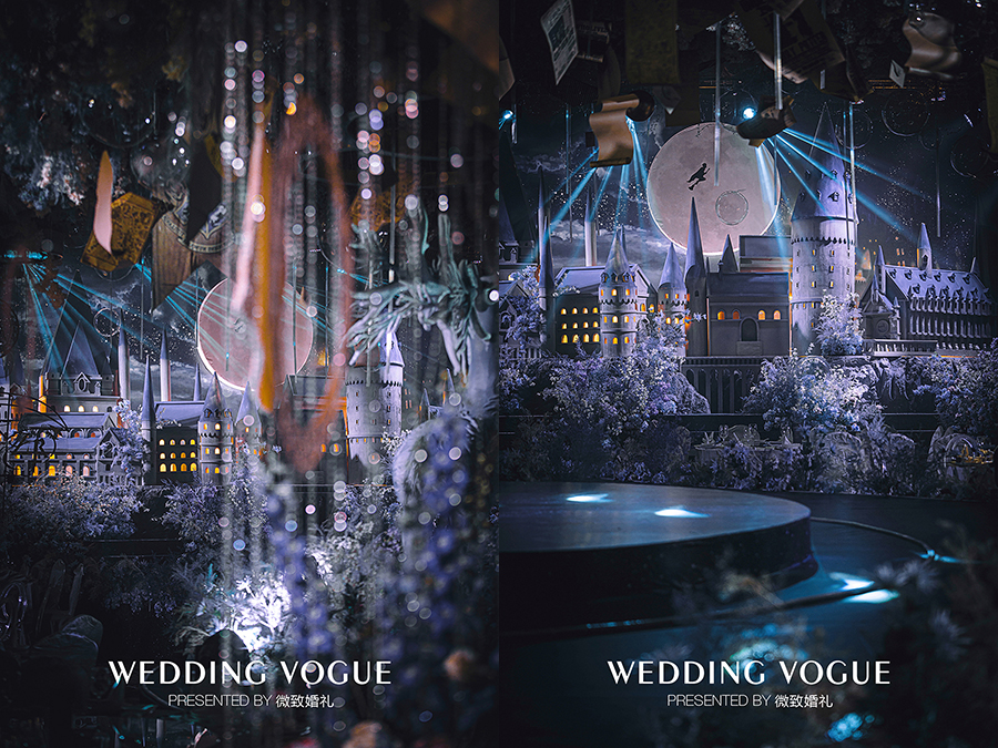 微致用婚礼的形式还原书中描绘的关于霍格沃茨的认知:它位于苏格兰霍格莫德村附近的森林里,建筑在雾气升腾的黑湖边,有许多灯火通明的塔楼,是一座总是在变化的魔法建筑,如果麻瓜靠近城堡,他们只会看到一片废墟...