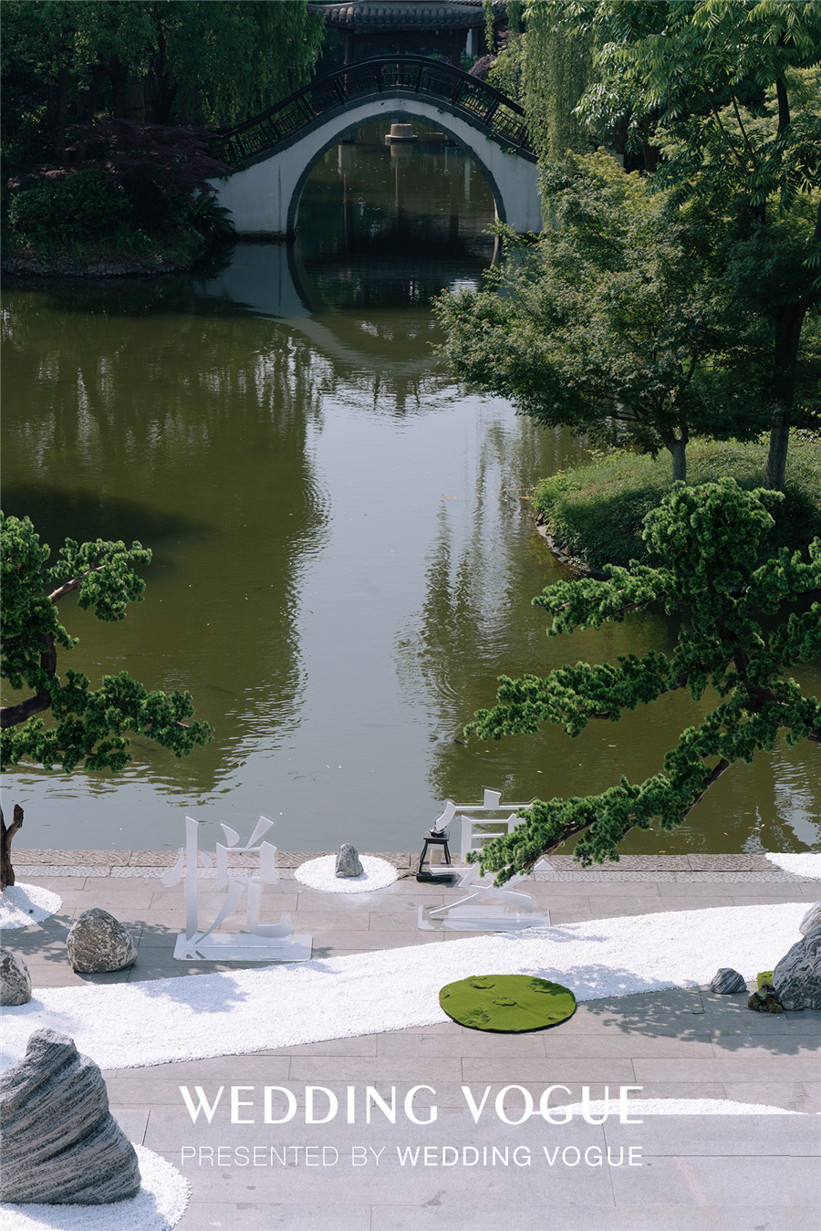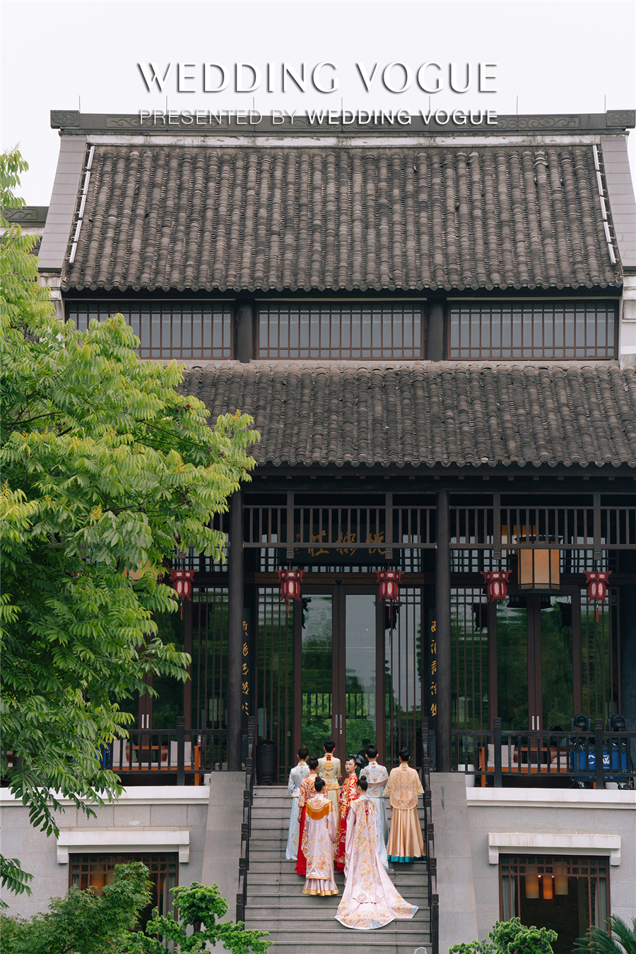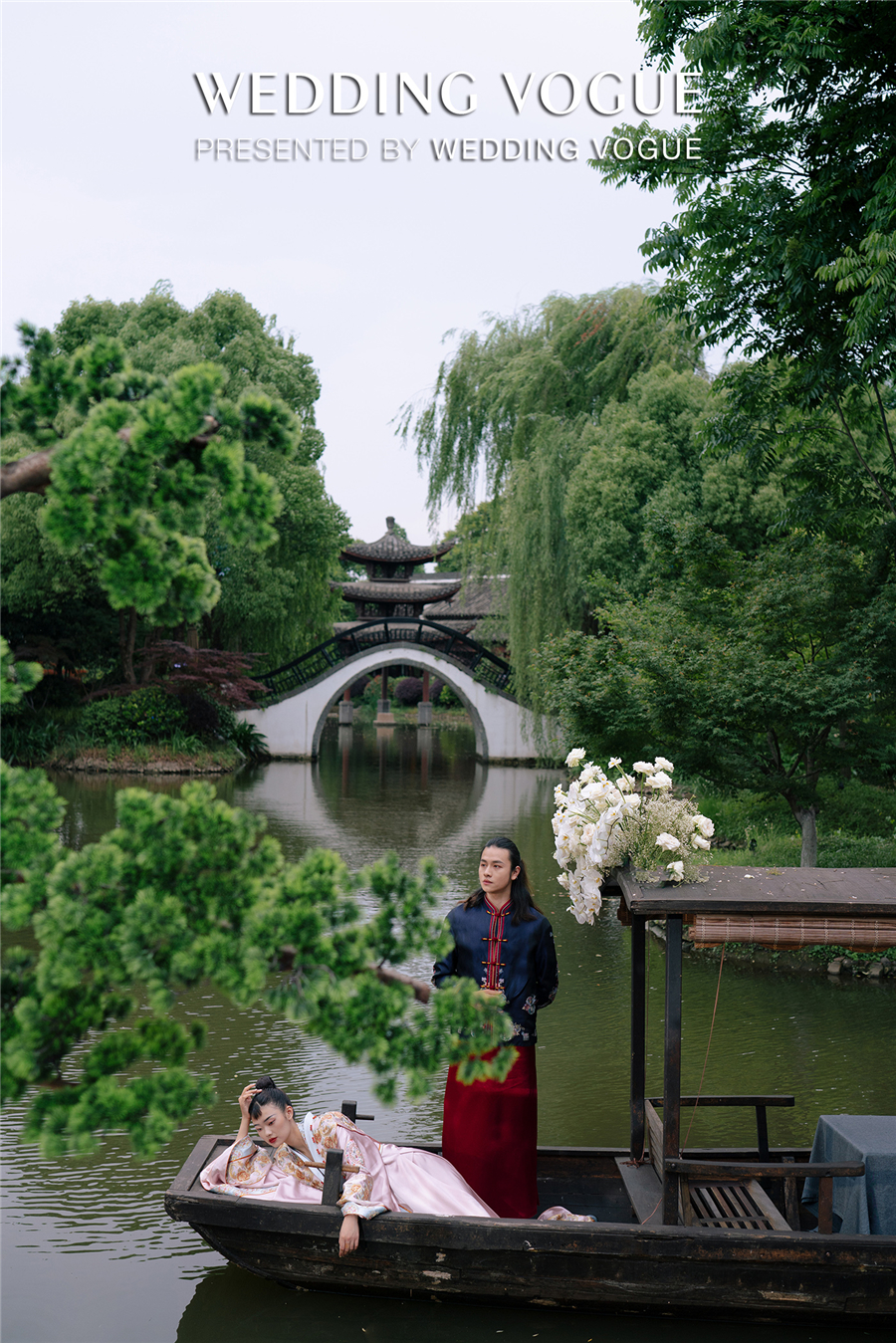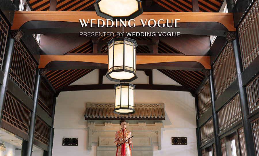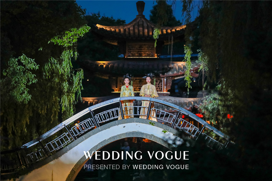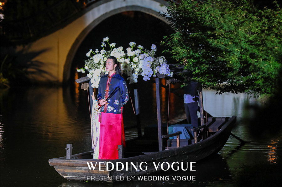 天色渐暗,古色古韵的西溪悦榕庄水台上演了一出主题国风大赏。烟雾流光笼罩着小桥流水、亭台楼阁,穿着新式国风礼服的“新娘们“由拱桥缓缓走到亲水平台,一对新人从桥下乘摇橹船向宾客驶来,如梦如幻,令人惊叹。