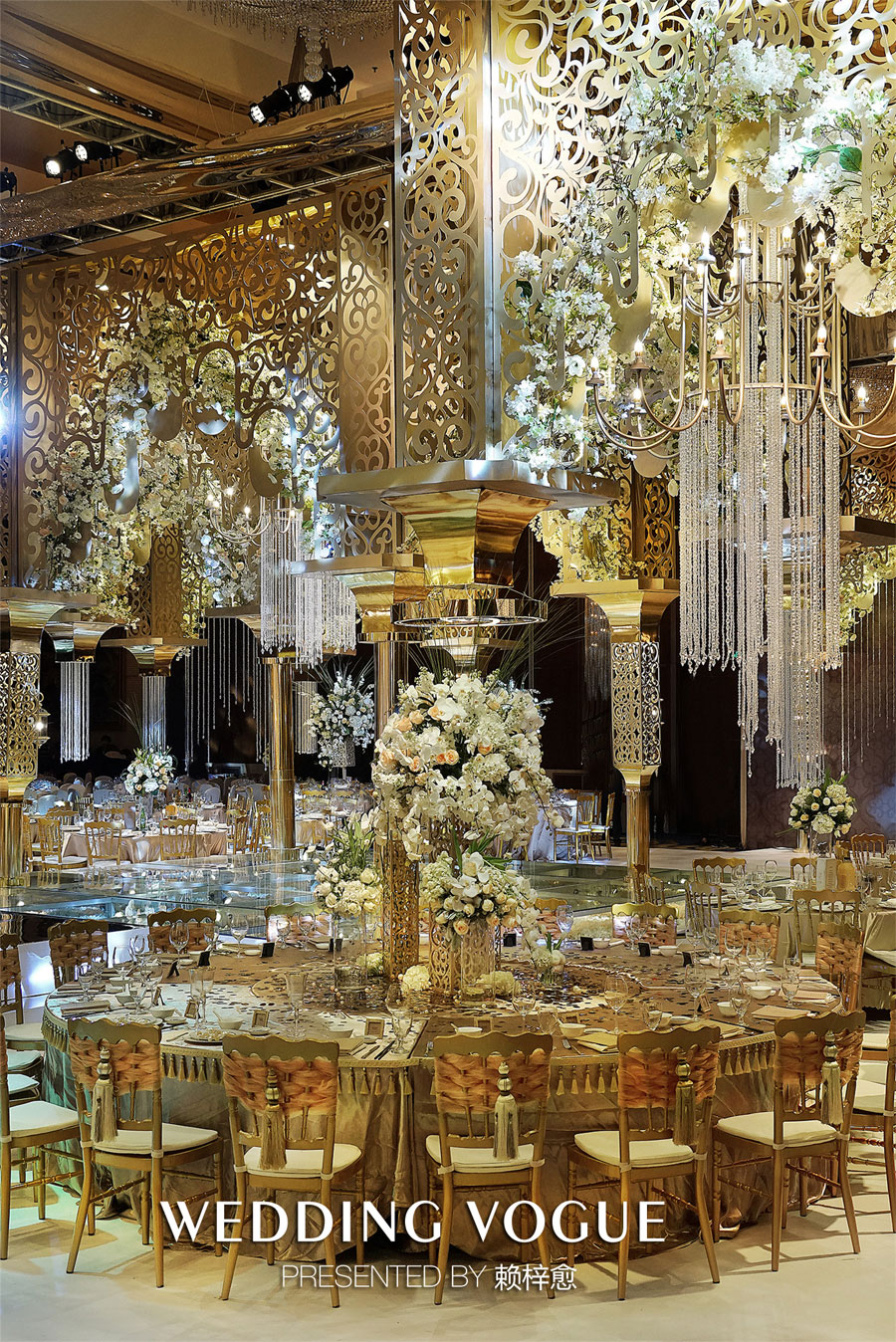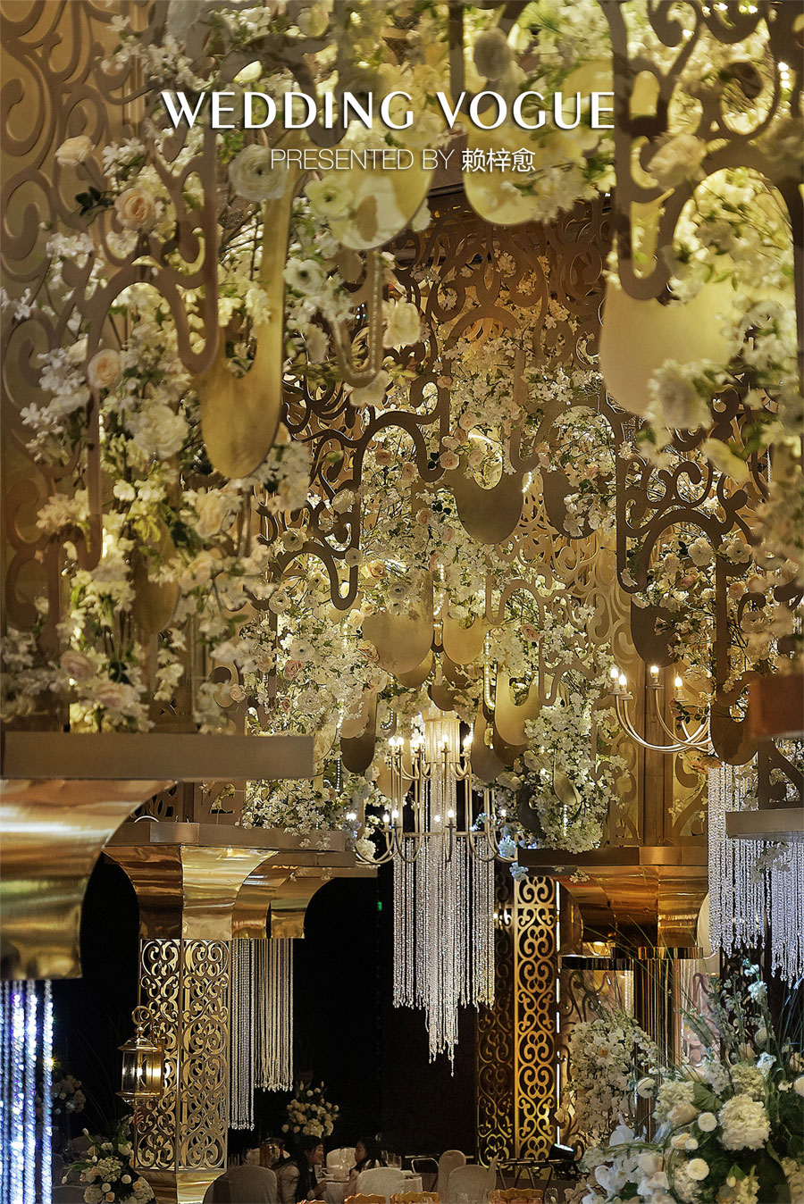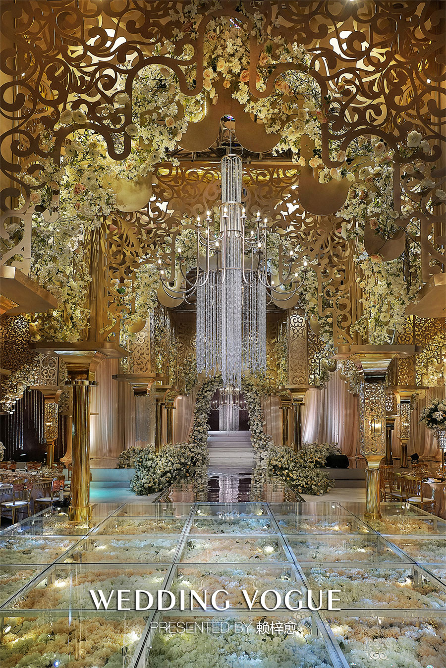 细碎的图文保留了古典的魅力,但却又与传统设计不完全一致,搭配的吊灯设计,还有垂挂的水晶链条模仿了宫殿的柱子造型,塑造奢华的精致感。花艺设计同样运用得很巧妙,没有做选择性重点凸显,而是融合进整体建筑造型设计当中,一种若有似无的柔美感,让整个场景浪漫异常。