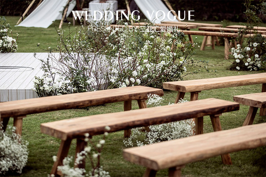 原始木质长椅整齐对称布局,花艺错落点缀其中。