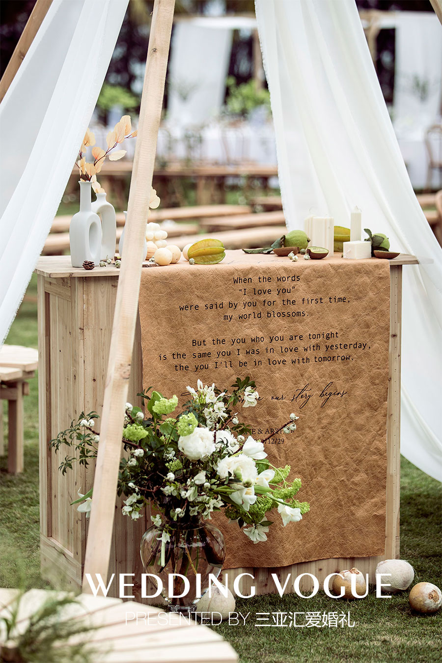 整场婚礼以原木做主要架构,白色轻透质地薄纱营造氛围,绿植叶片错落缠绕,疏密相间。