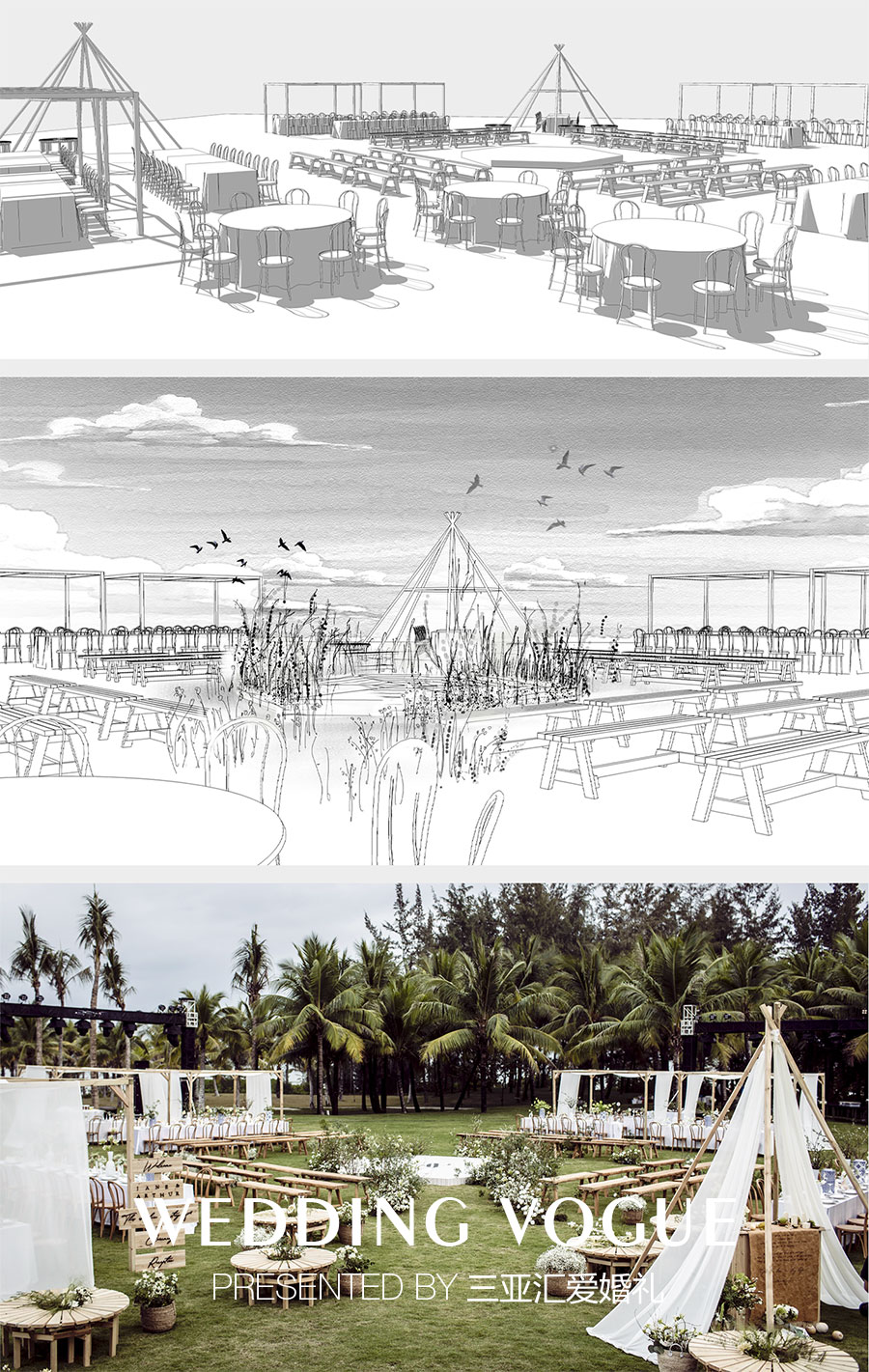 设计师以整块草坪,去背景化设计,做露天宴会一中心仪式一体结合布局。