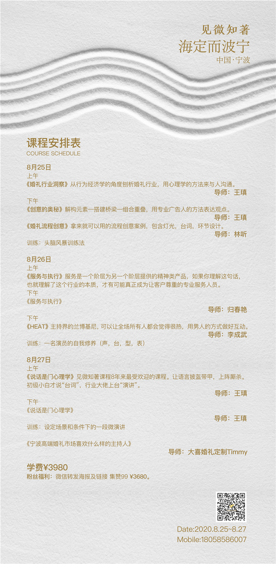我们会邀请宁波地区一流婚礼机构之一来分享哪类主持人是受欢迎的。并请你准备好自己的资料,报价和样片,录入他们的主持人资料库,加一下甲方爸爸的微信。