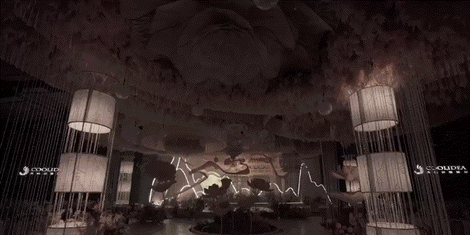 于是设计师将灯塔元素与中式建筑审美相结合,打造出空中浮动的亭台楼阁,与主舞台上方营造的缥缈浮云相结合,轻盈而隽逸。