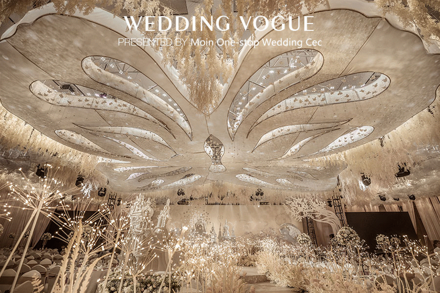 婚礼现场的顶部做了整体结构的蝴蝶造型,利用灯光的流动渲染出翩翩起舞的效果。童话故事里,王子和公主总要跳一支舞作为happy ending,在琴声中公主的水晶鞋步步生花。