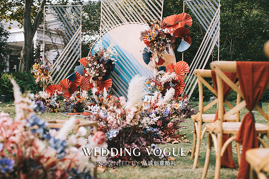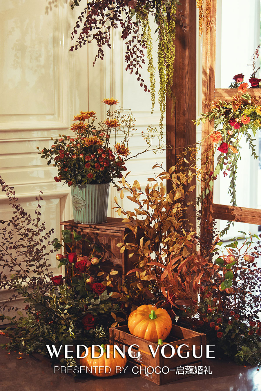 麦穗黄、琉璃绿、枫叶红…都是属于秋季复古婚礼的色系,婚礼上的花卉,颜色深浅不一,