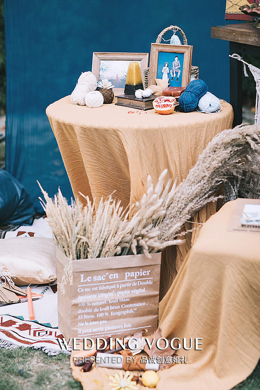 原木色和姜黄色给人质朴的感觉,采用了大量的复古秋色的花艺、搭配精心挑选的小摆件,让现场变得秋意浓浓。
