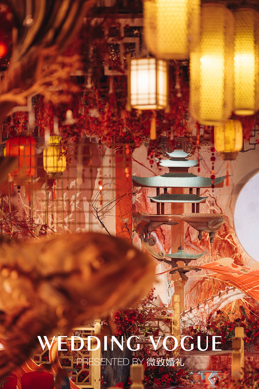 对于新中式婚礼的设计,浪漫不仅在于设计时细致入微的考量,力求把婚礼现场化为咀嚼四时风华的不二之地,