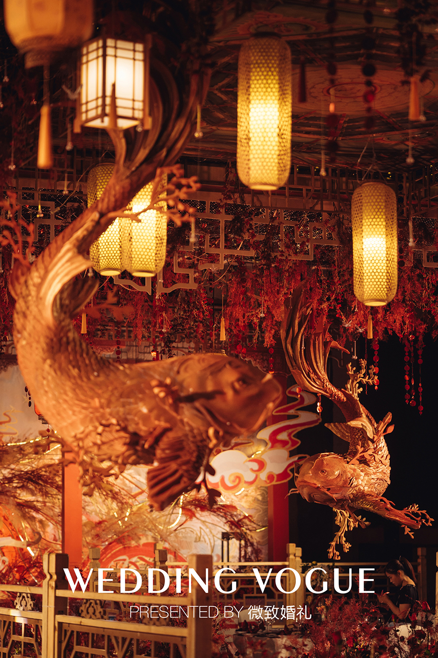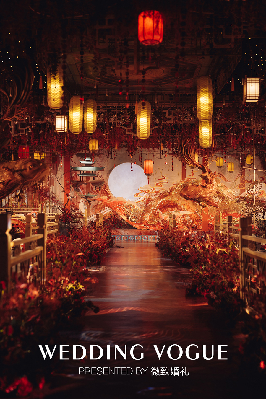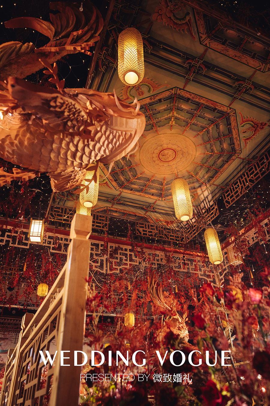 云顶设计灵感源自雕梁画栋的华美宫殿,并装饰华灯,当灯光暗下,燃起的红光,点亮婚礼现场,漫天华灯,繁华一时无色。