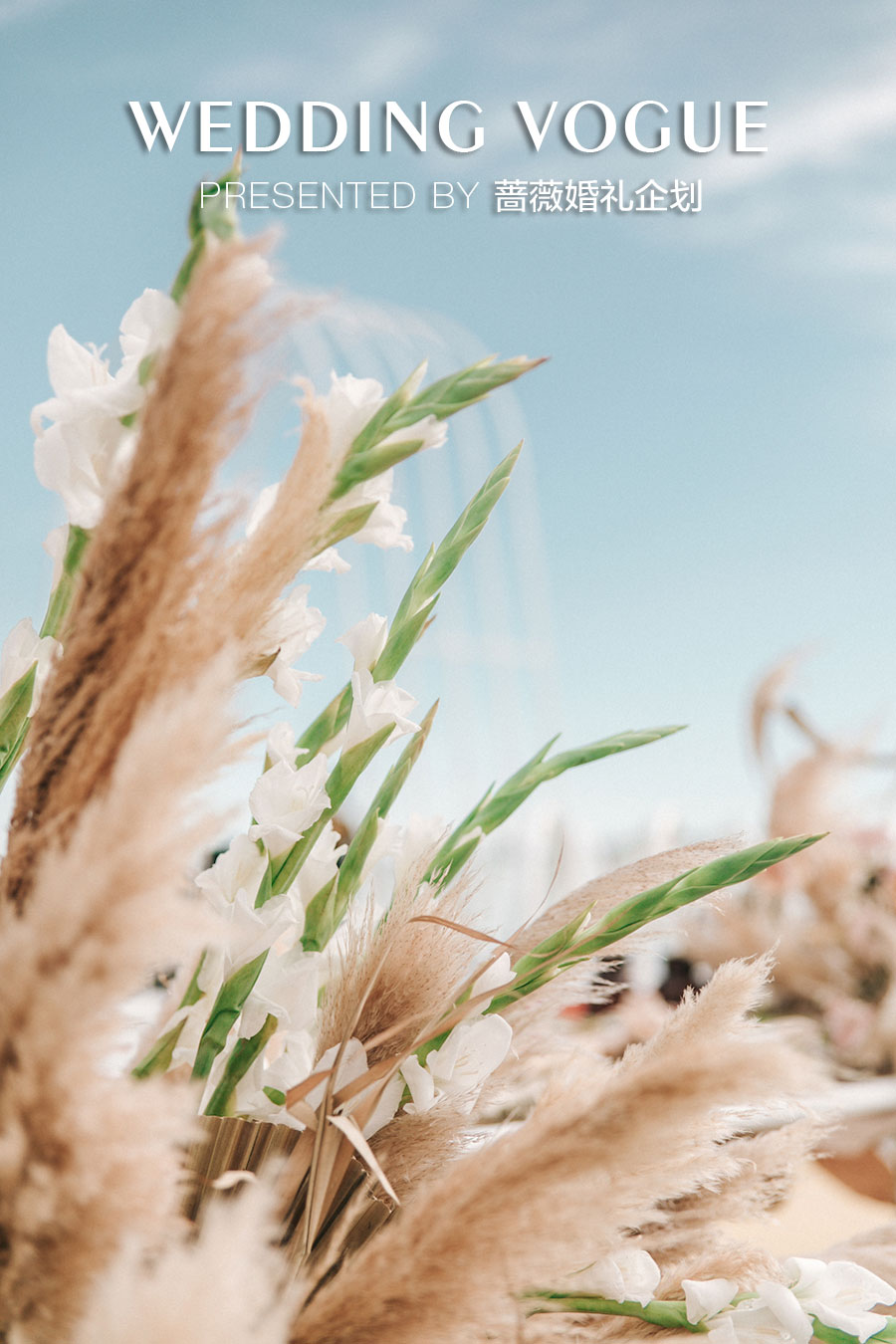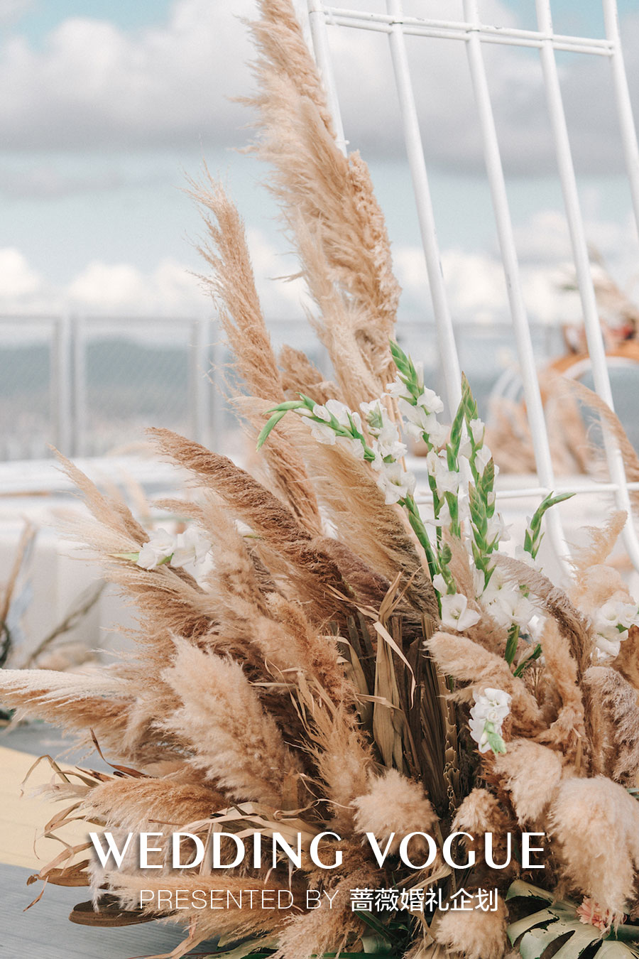 加入蒲苇辅以点缀,蒲苇花穗长而美丽,轻盈灵动,既给人一种秋色系温暖的视觉美感,又寓意两人的爱情天长地久永远不变。