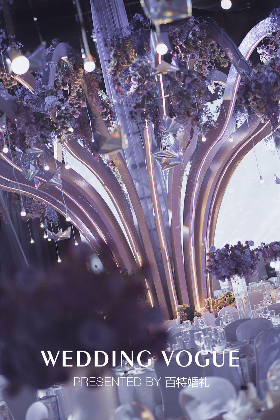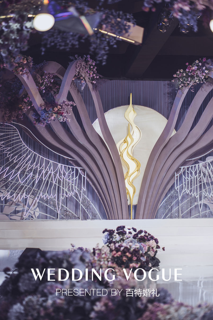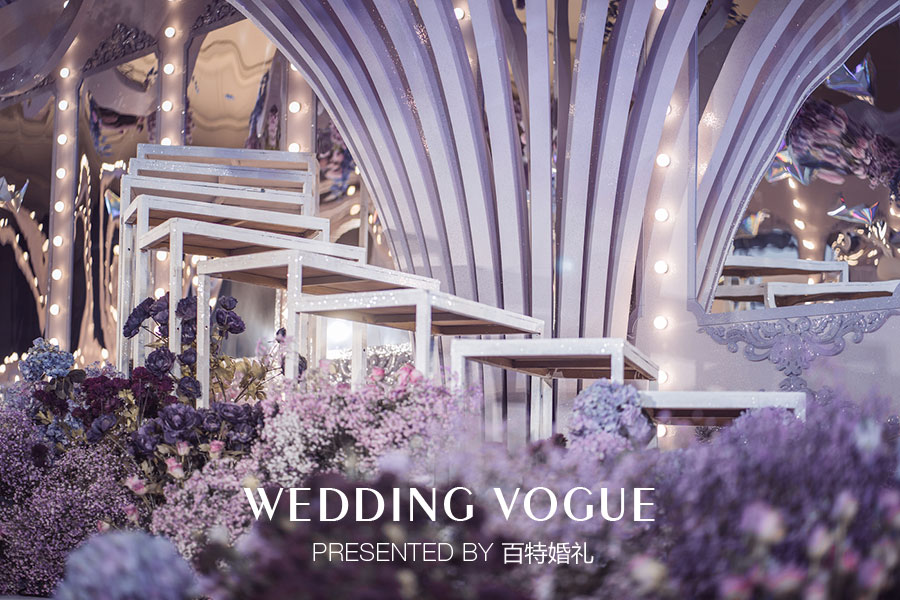 在婚礼色彩设计上,以天秤守护色紫色为基调,由冷到暖层层递进的颜色,正如情感从陌生到火热,
