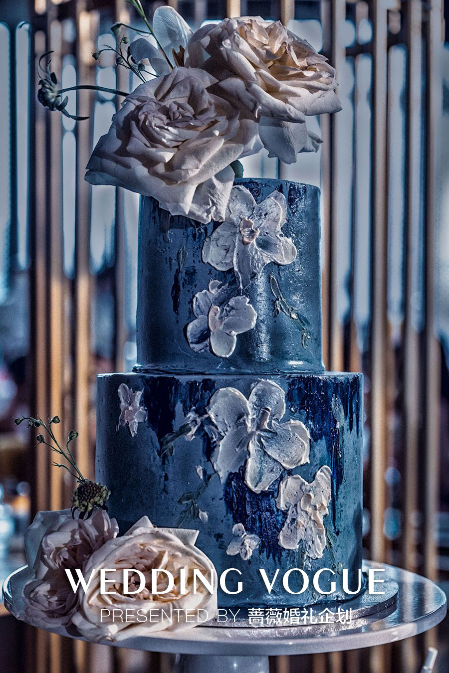 蓝色花朵和水晶在坠落间颤动,银河系般深邃的背景与水晶珠帘营造出别致的渐进层次感。