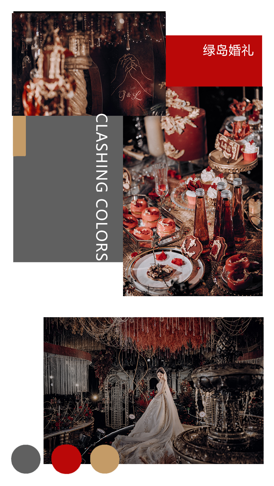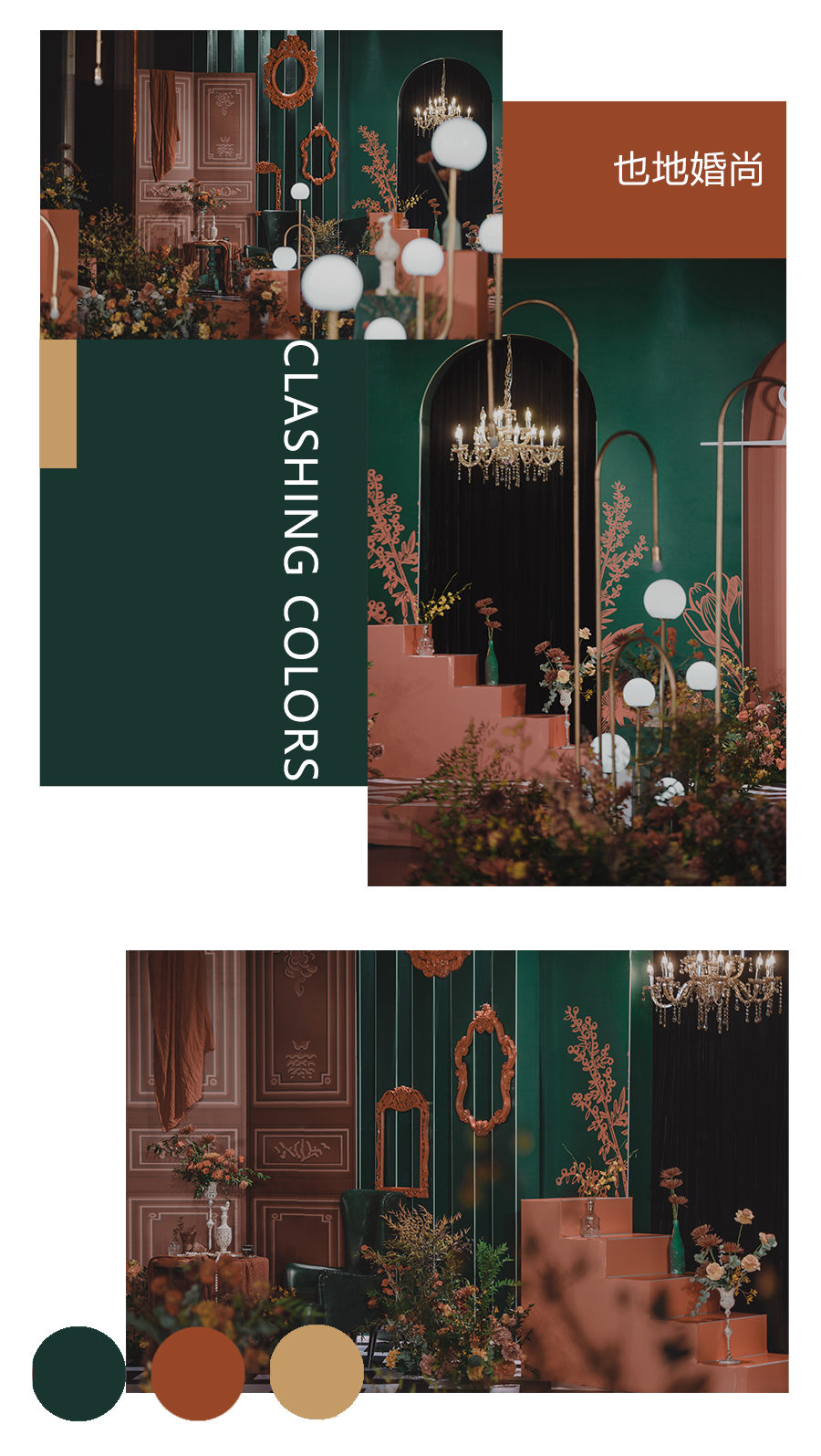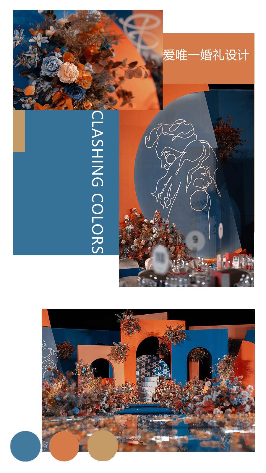 区别于传统婚礼的安全区配色,撞色婚礼用令人眼前一亮的颜色设计传达出新人独特的风格与不凡的气质,