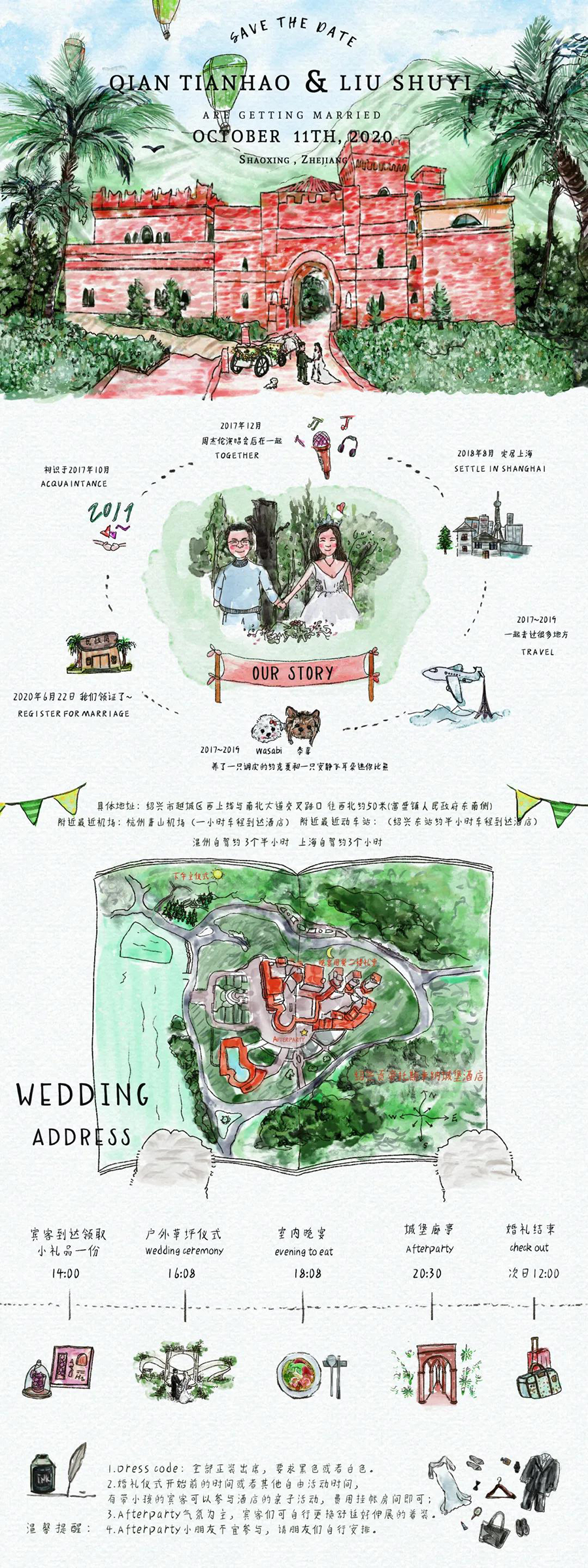 这是他们的手绘婚礼邀请函,不套模板,独一无二,满满都是用心。连同婚礼当天的回忆一道,都值得妥帖收藏,成为生命里一簇美好的花火。