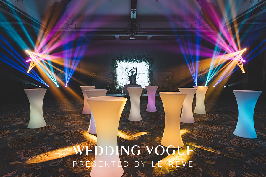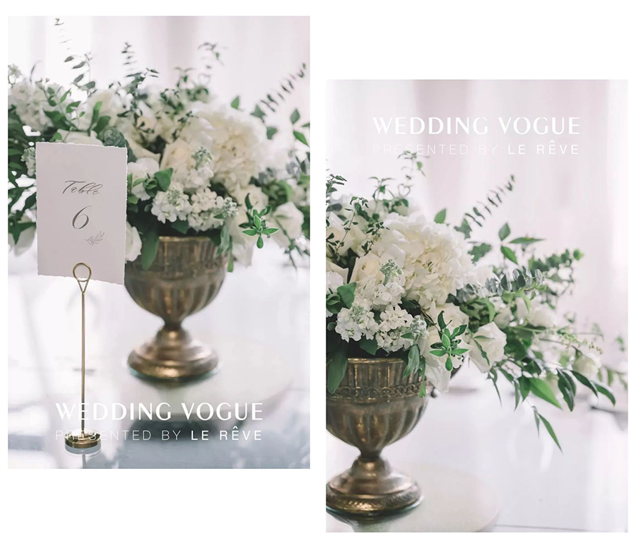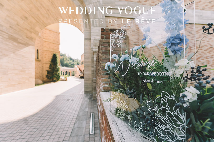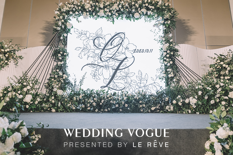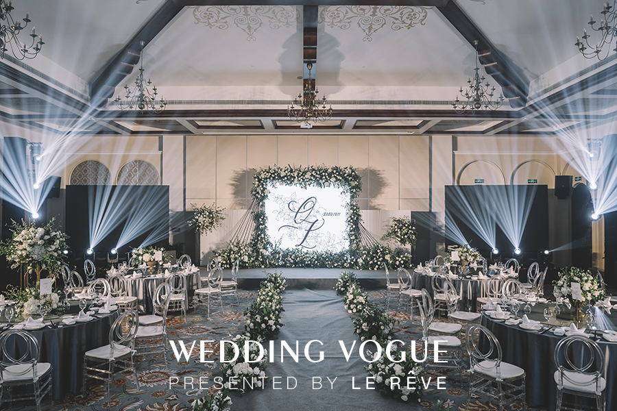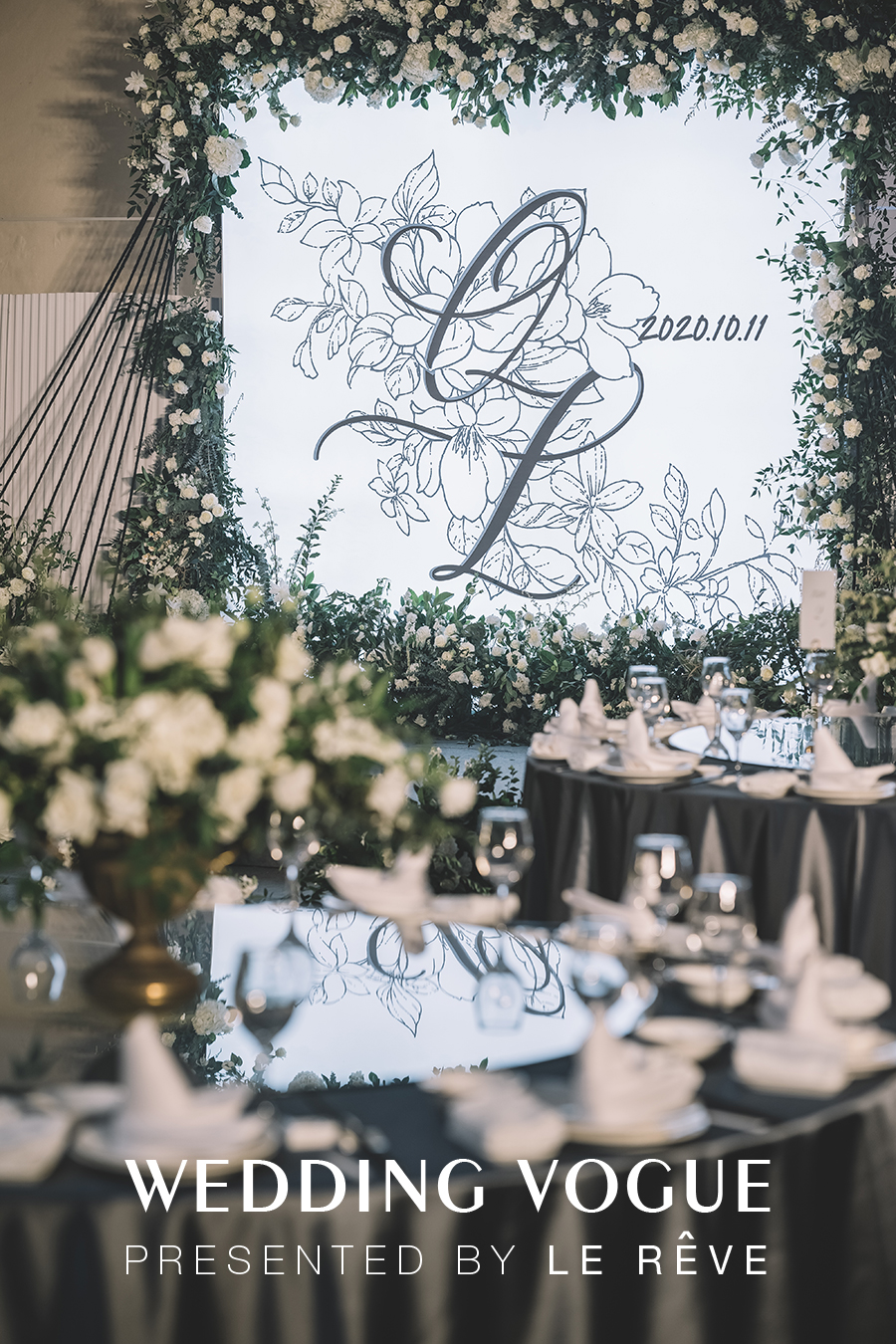 他们的姓名缩写,镶嵌进优雅的晚宴舞台背景,落笔之处,有鲜花温柔盛开。如此简约,却又大气巧思。