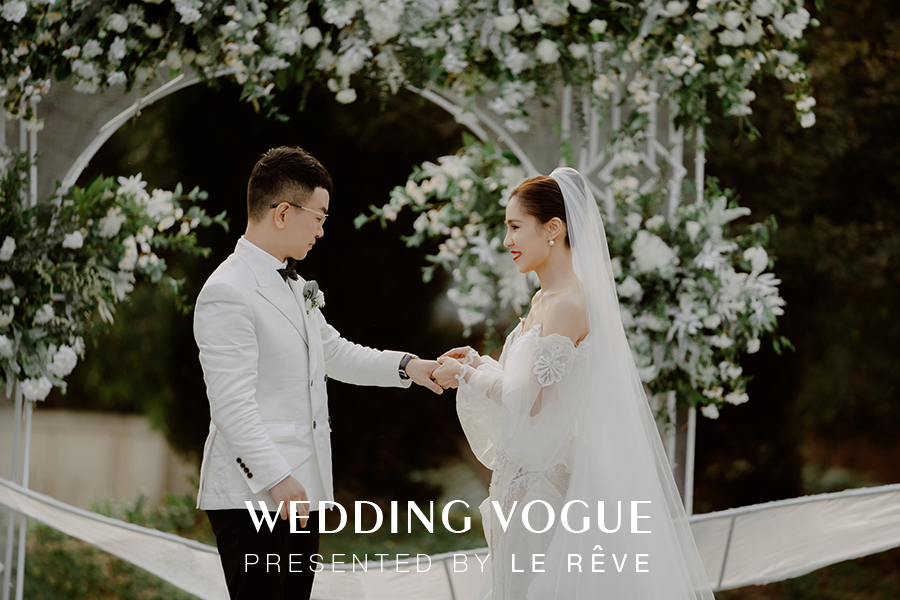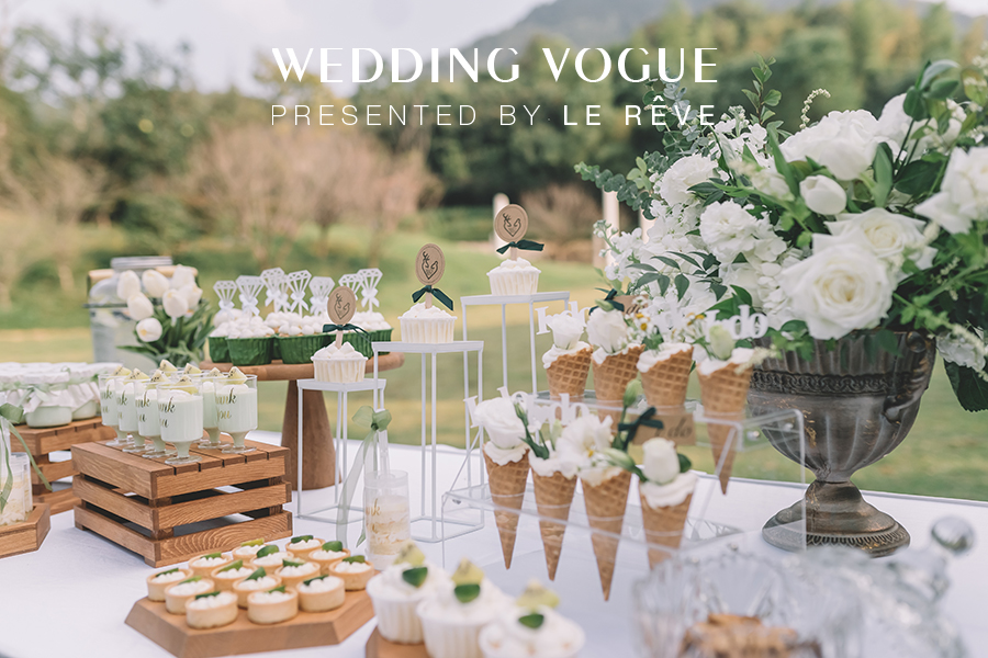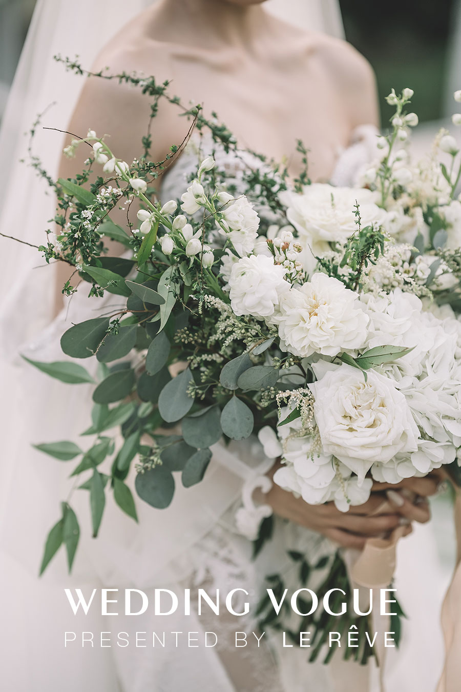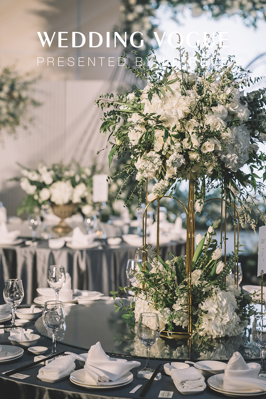纯白浅绿的花艺盛放其上,堆叠优雅的仪式感。