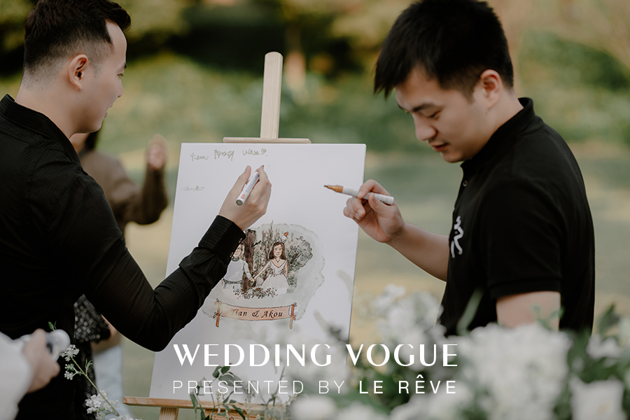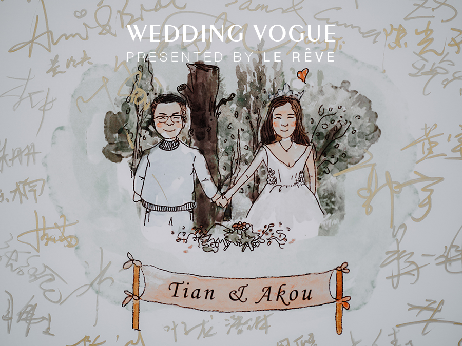 新郎新娘手绘的画板,是独一无二的签到本。宾客的落款一枚枚将他们环绕,也用祝福将爱包裹。