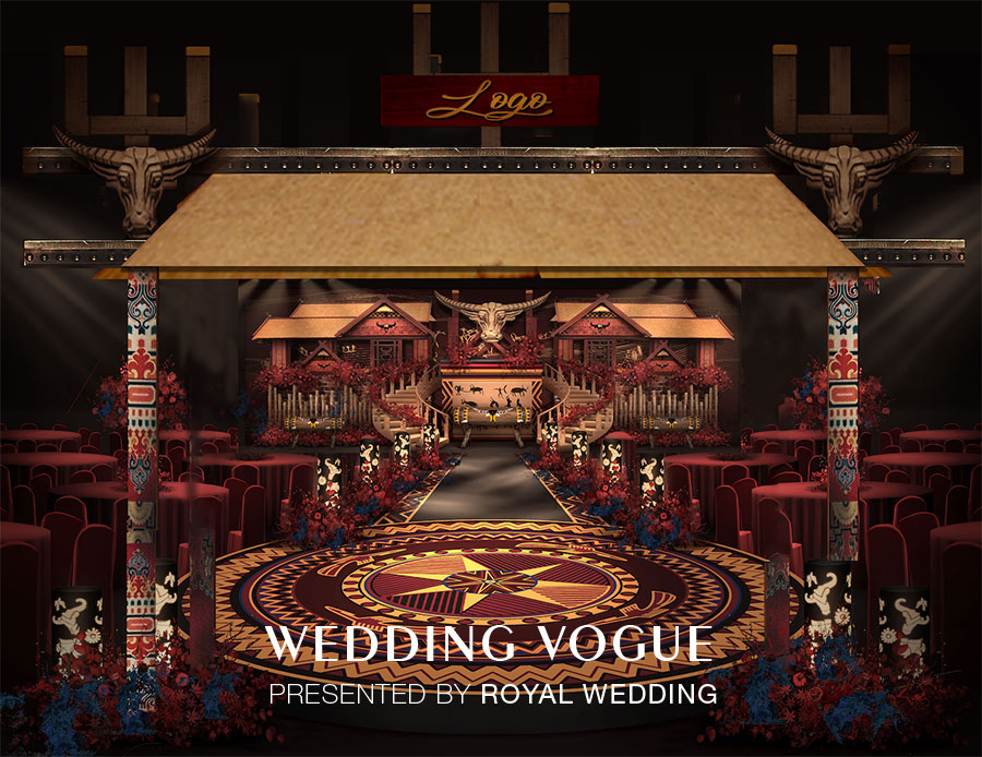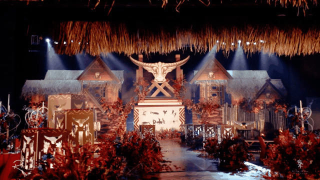 要在婚礼上重现佤族的村寨,那么首先要考量的是如何将层层叠叠依山傍水的村落形态呈现在舞台上。设计师综合考量,选用图腾牛在舞台中间,两边是村落房屋,而在交界处用村落门口类似门型的结构来呈现立体感。
