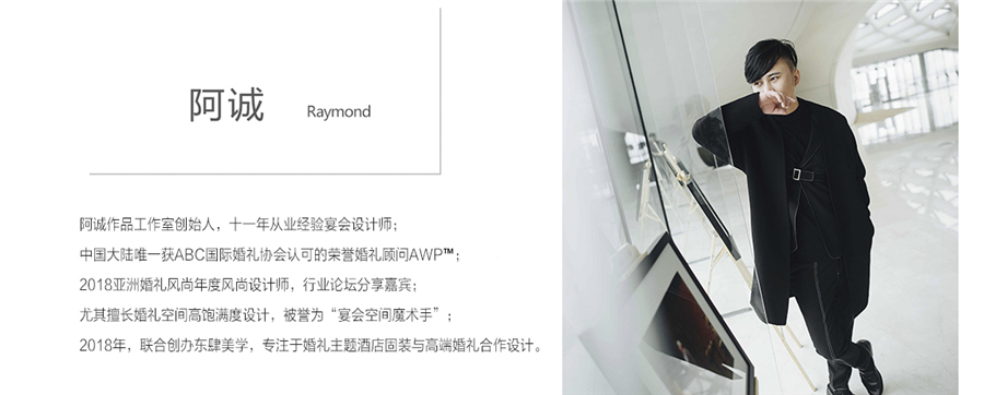 作为东北区域首位加入婚礼风尚的宴会设计师,阿诚一直活跃于全国婚礼设计的舞台,并且出现在各大权威行业论坛上,为东北设计发声。