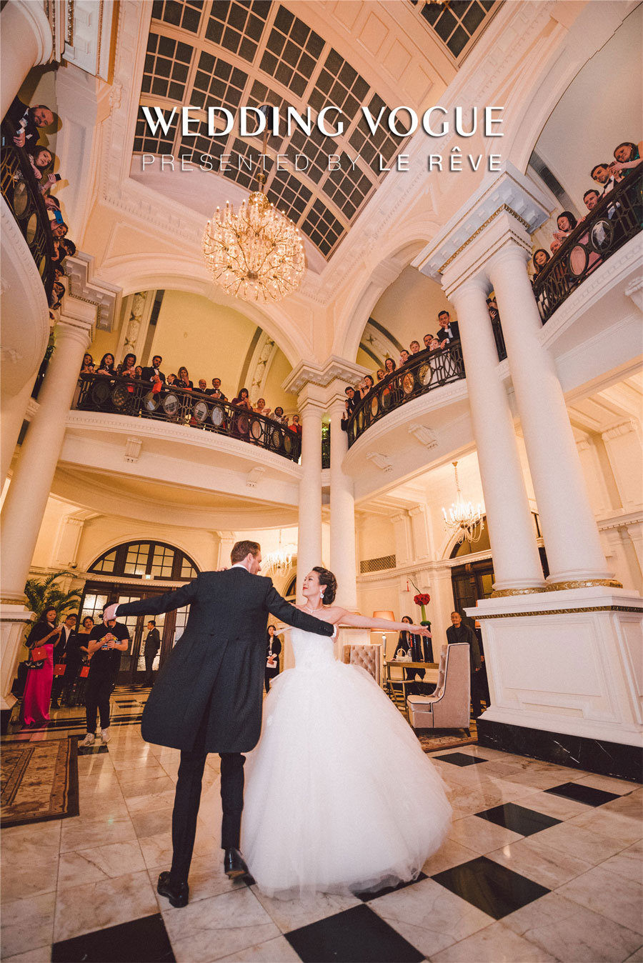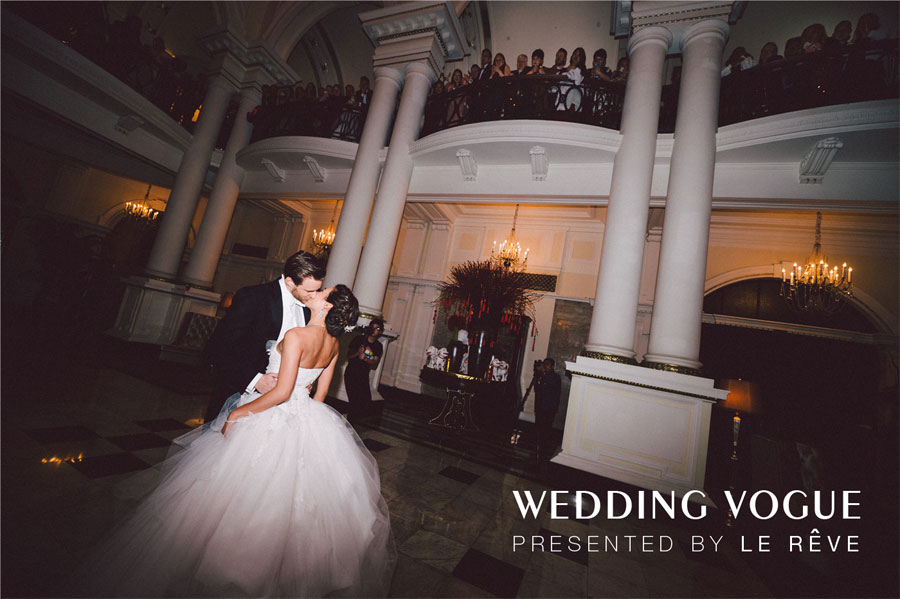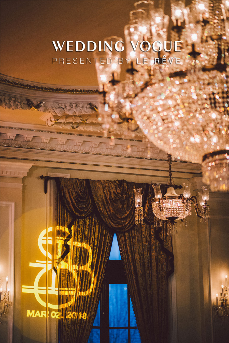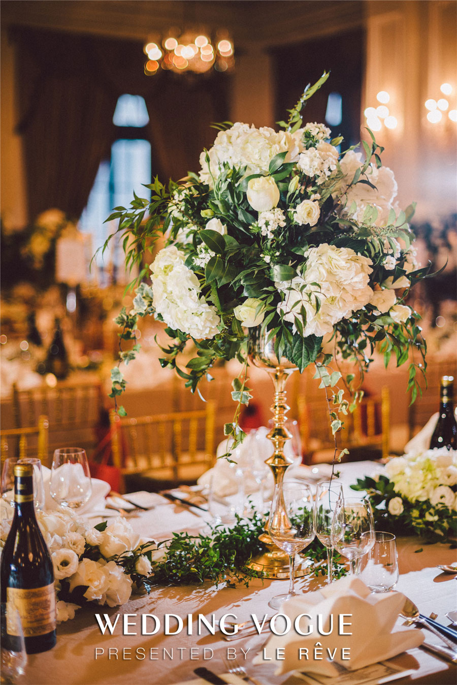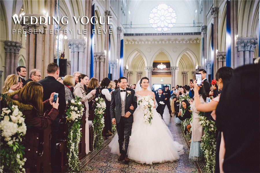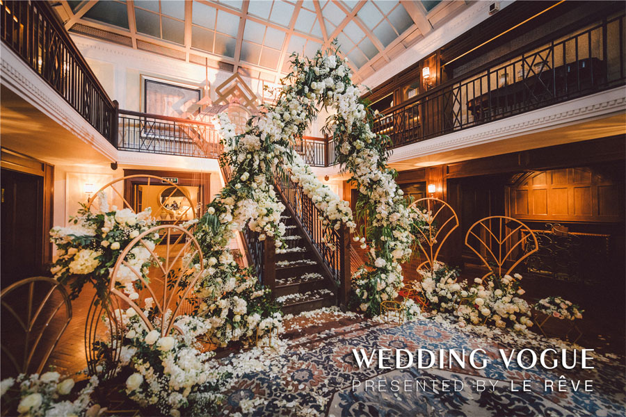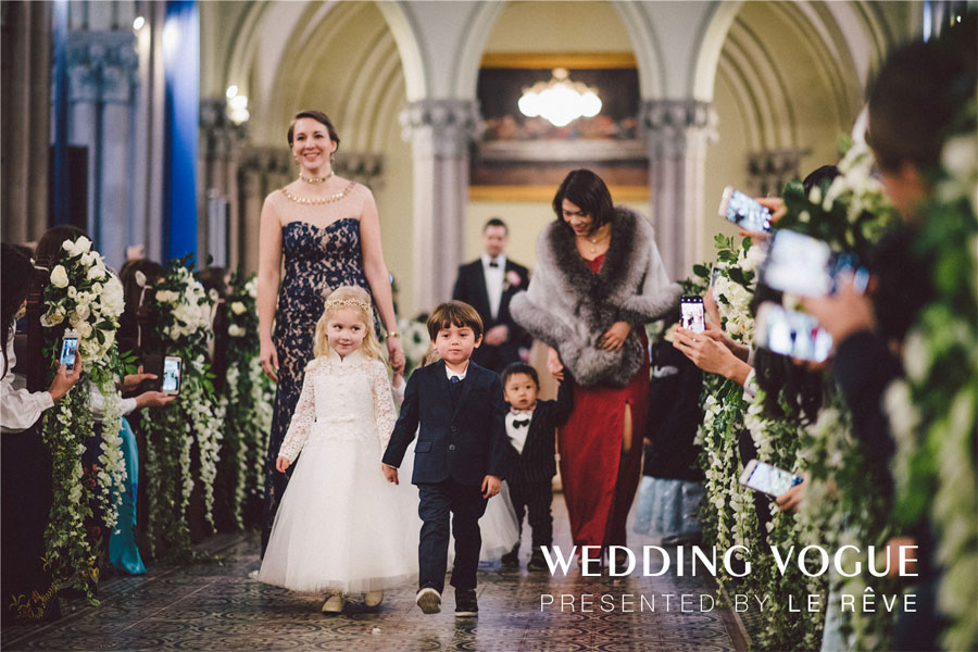 在场地的选择上,首选选择了经典的西式教堂作为仪式场地,以及具有新古典式建筑味道的华尔道夫酒店作为婚宴和派对场地。选对了场地,婚礼就成功了一半。在教堂的布置颇为经典,采用在西方代表圣洁和永恒的白绿色,做了不喧宾夺主的设计布置烘托气氛。