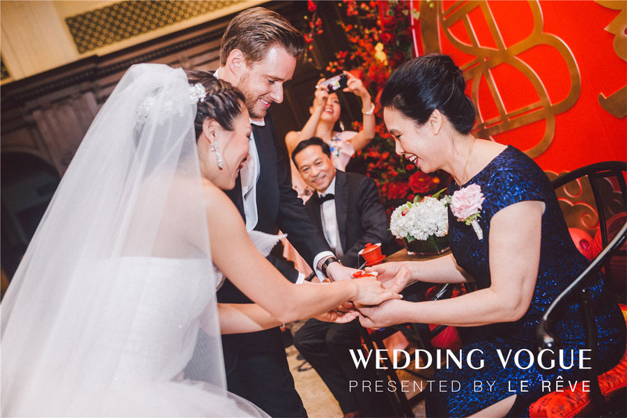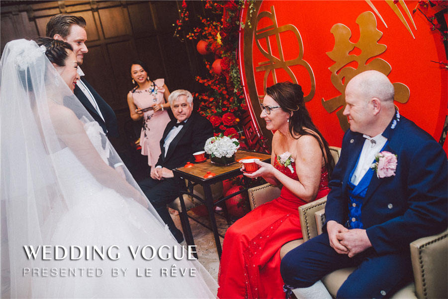 经典的西式仪式流程之后是传统的敬茶环节,京玺国际用传统中国红以及喜字、纸灯笼等元素设计了敬茶的背景,塑造浓重的中式传统气氛。而Alex 和 Carolyn除了父母之外,还额外给每一位敬重长辈敬了茶,保留和延续这份美好寓意。