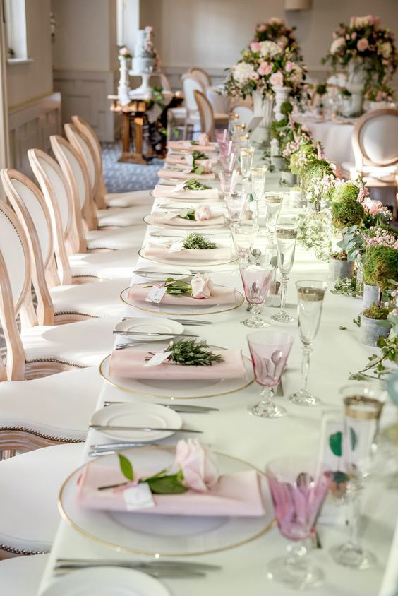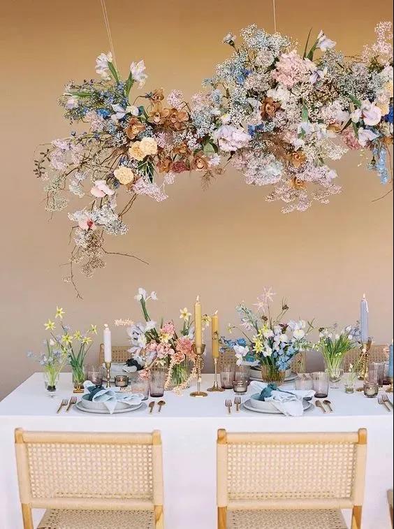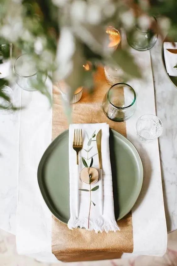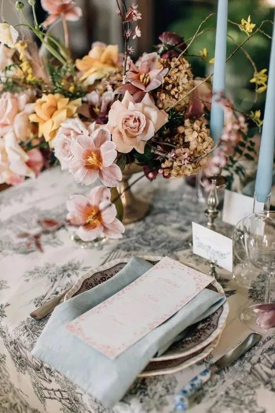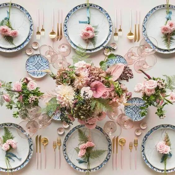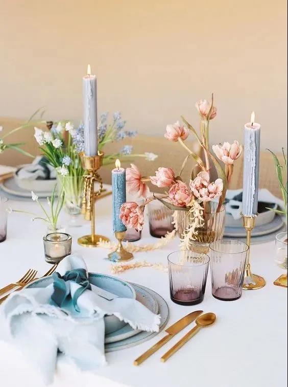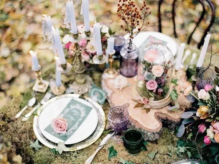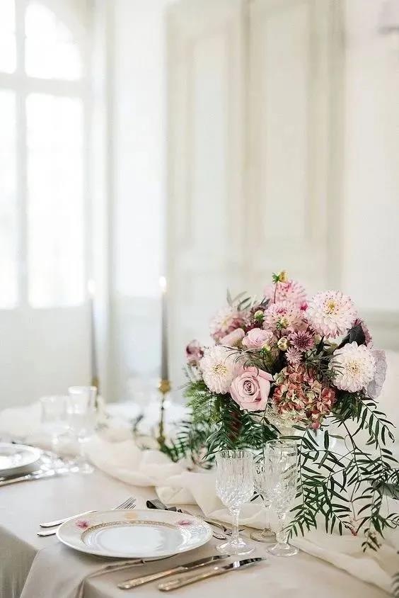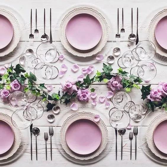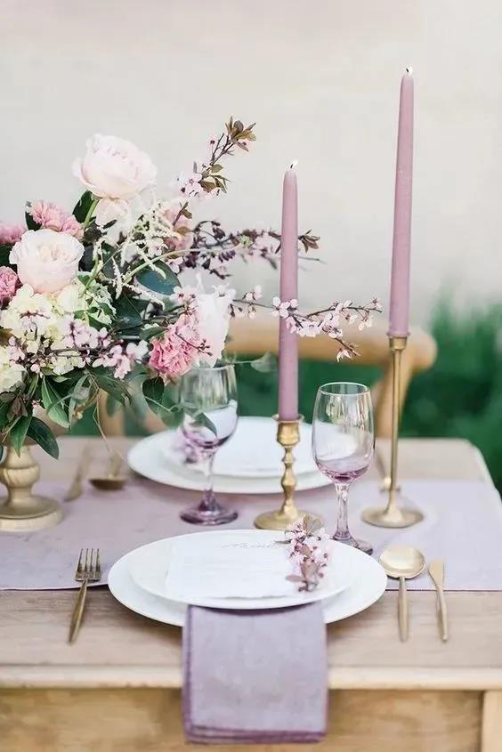高明度活泼的薄荷绿、粉紫色搭配低明度的原木色,带有一种明显的复古优雅感,我们可以将这样的配色沿用到我们的婚礼晚宴的餐桌布置中。