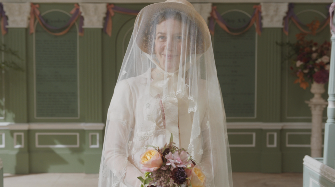 影片的开场就是一场教堂婚礼,豆绿色的教堂配合了白色的石膏雕花,简洁且优雅。即便装饰了砖红色的丝带和酱紫色的鲜花也毫不违和,反而带来一丝华丽感。