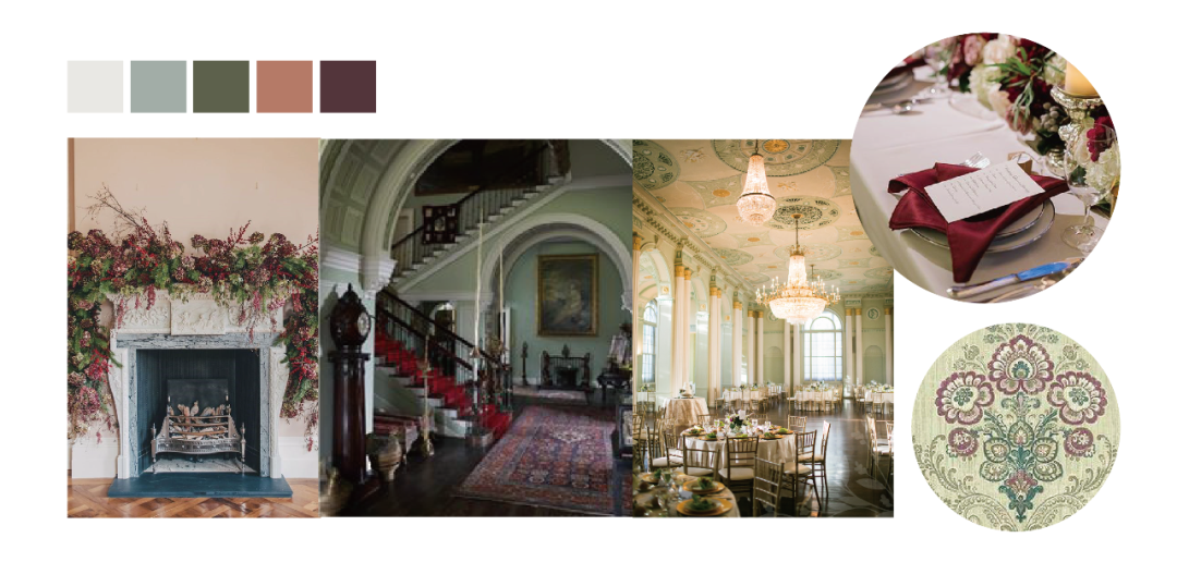 因为新娘是爱玛的家庭教师,是一场对爱玛有着母亲般关怀的角色的婚礼,所以白绿教堂中配上一些酱紫色和丝绒质感会更合适显得更加成熟和优雅。