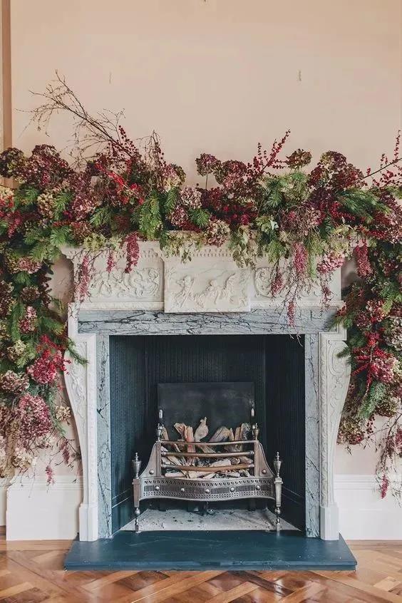 薄荷绿的茶室,侧面壁炉上布置了粉紫色轻柔的花艺,而桌子则选择了原木色这种重色。