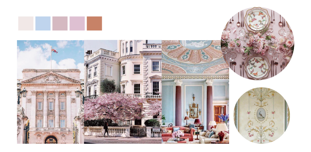 整体为高明度低纯度的冰粉色,其装饰边框点缀了些许蓝色。