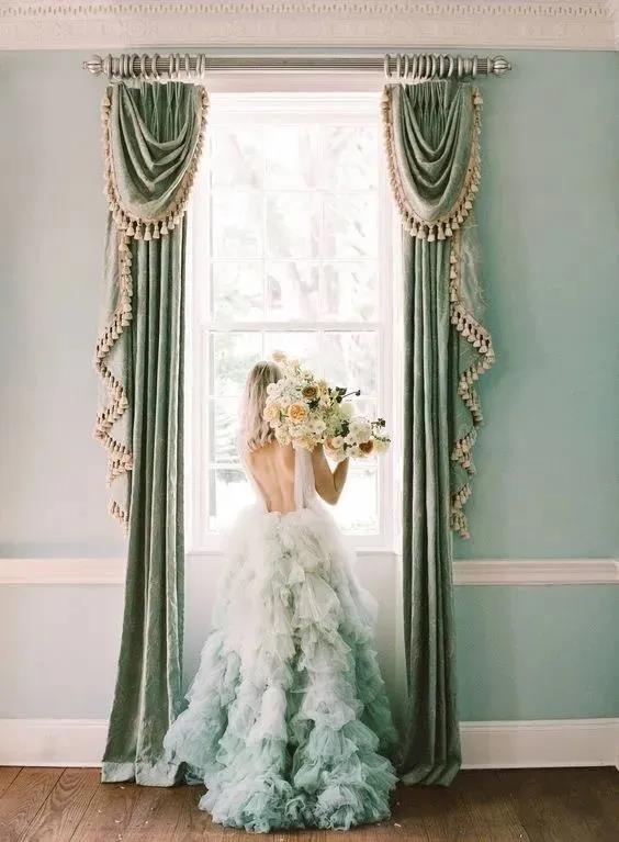 黄色的墙壁绿色的窗帘,画框点缀的藤蔓与爱玛裙面的花纹交相呼应相得益彰,有时候婚礼是否能让新人满意就体现在这些细节上。