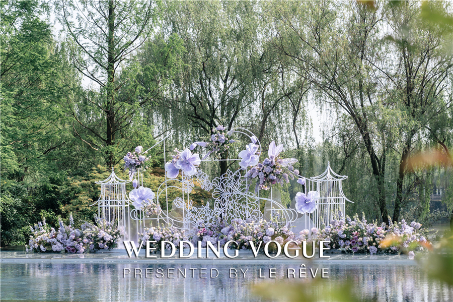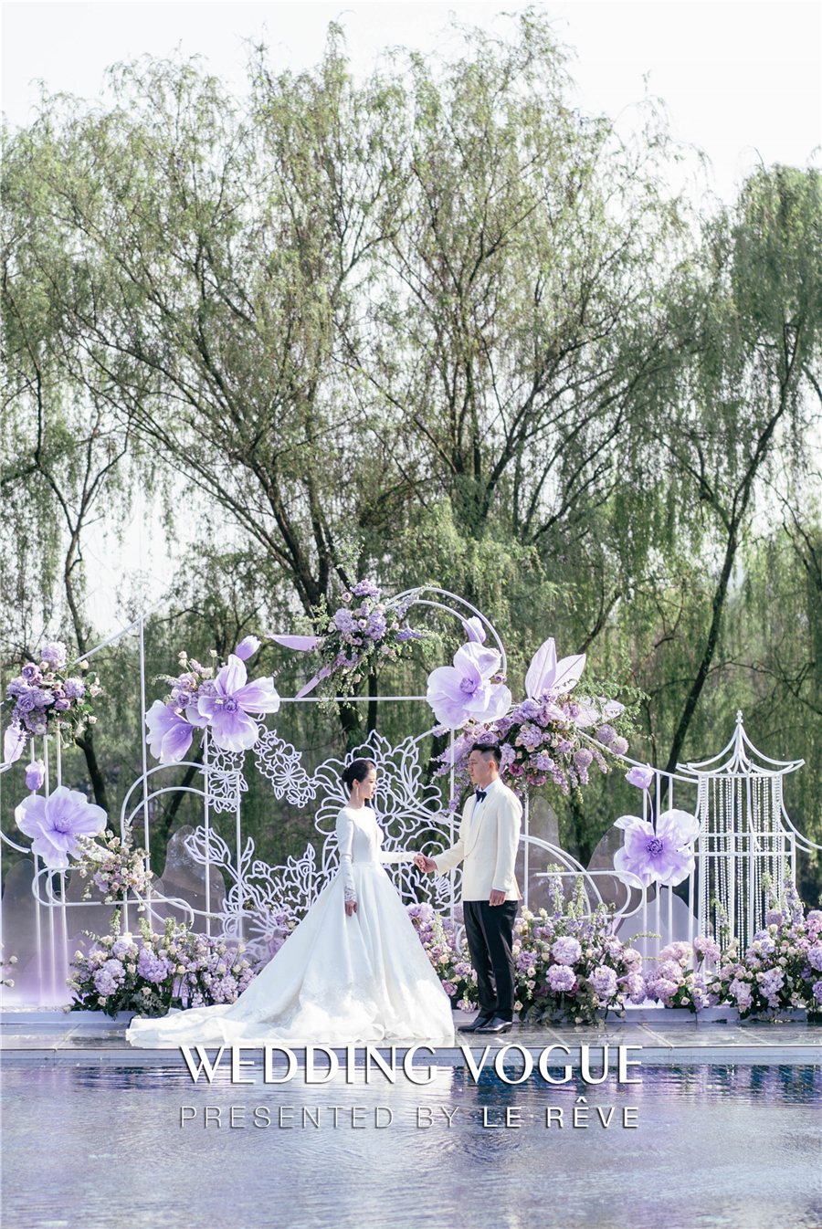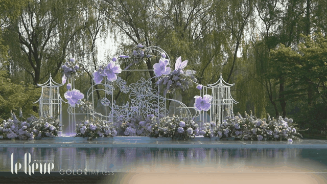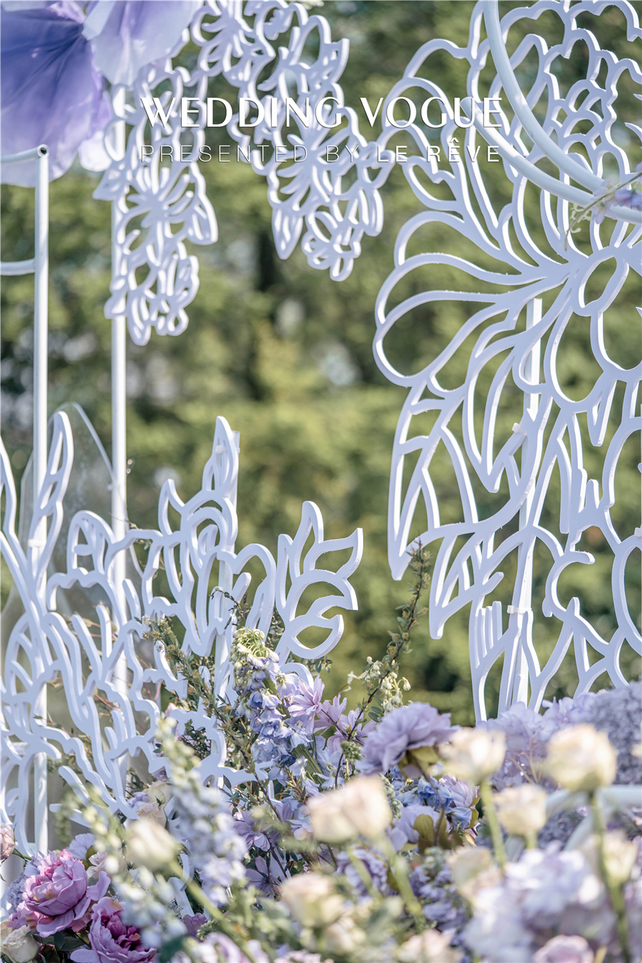 因为倒影会做“乘法”,设计上便更偏重线条感与简洁感。整个仪式的“骨”选用了线性的铁艺,在洁白流畅的线条上,盛开团团由白到紫渐变的花卉,整体呈现出淡雅温柔的况味。