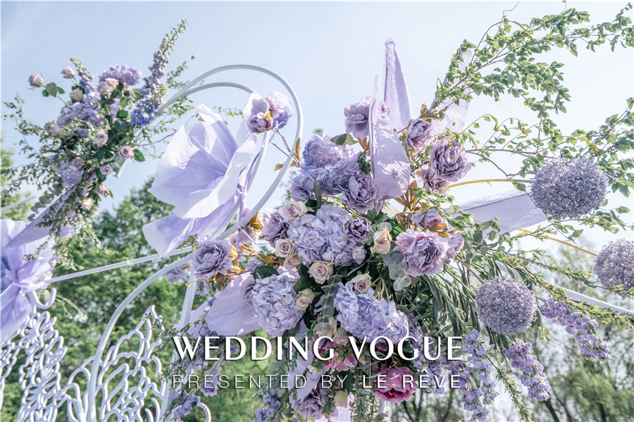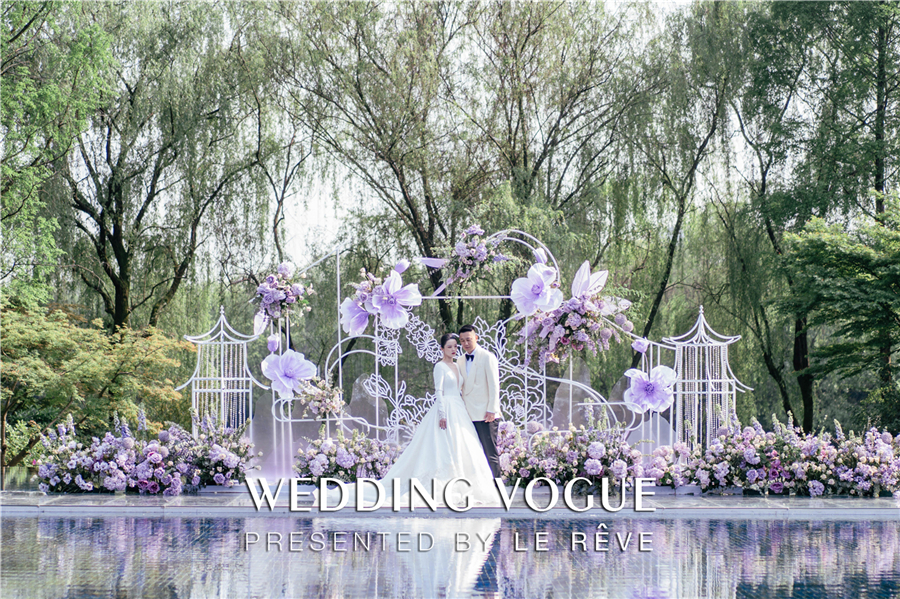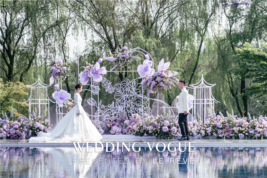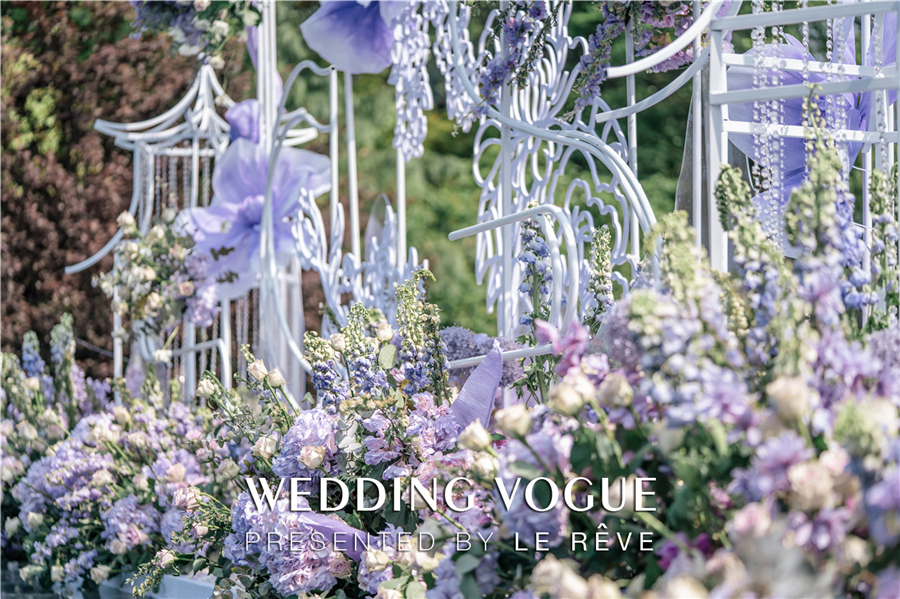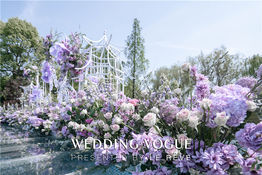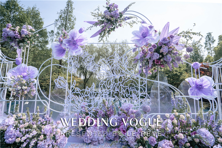 因为倒影会做“乘法”,设计上便更偏重线条感与简洁感。整个仪式的“骨”选用了线性的铁艺,在洁白流畅的线条上,盛开团团由白到紫渐变的花卉,整体呈现出淡雅温柔的况味。