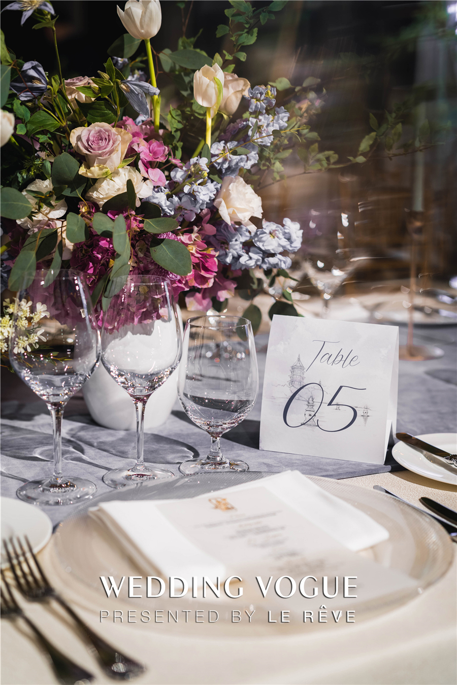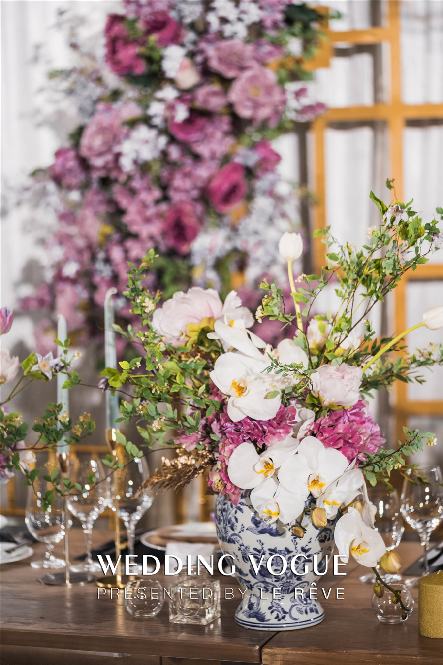 与青花瓷的色调相仿,晚宴的桌花特别添加些许蓝色、白色的元素。它们与欧式的金色、玻璃烛台,金色、渐变色蜡烛,以及紫蓝灰的桌旗,呈现出和而不同之美。