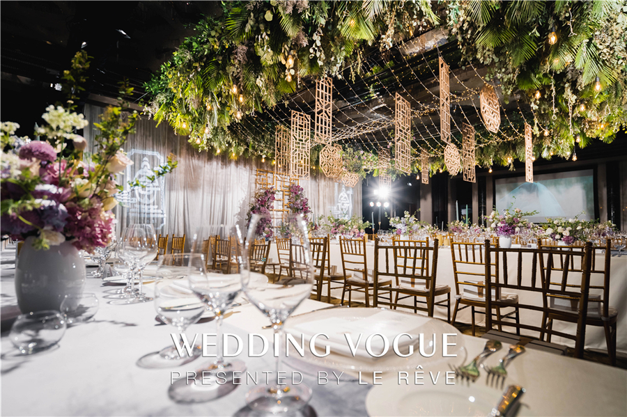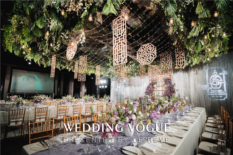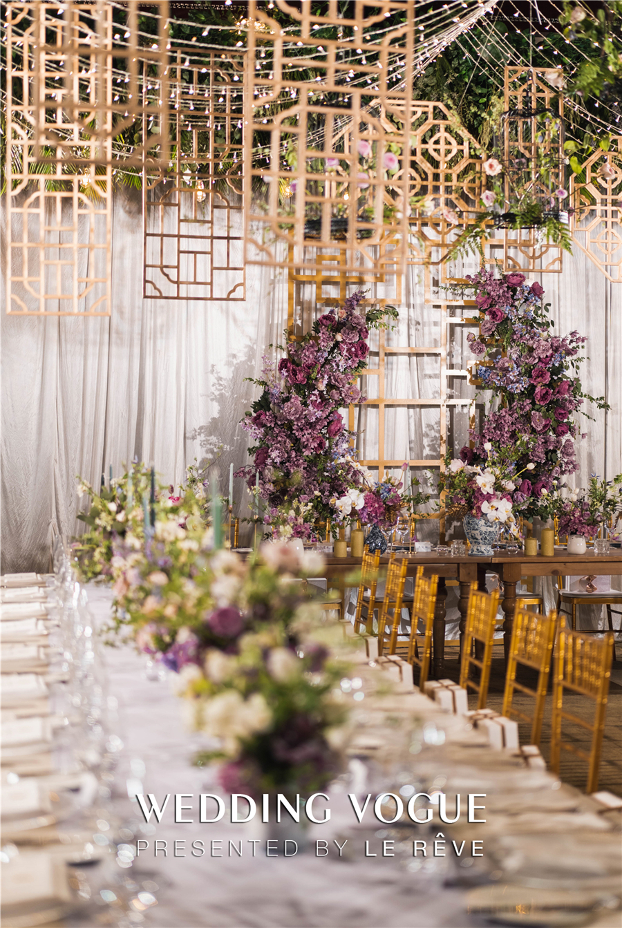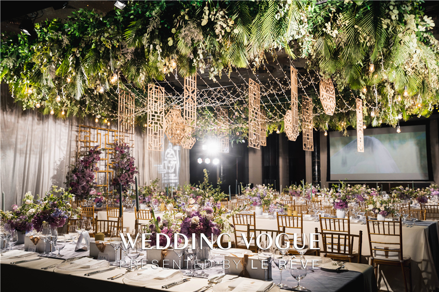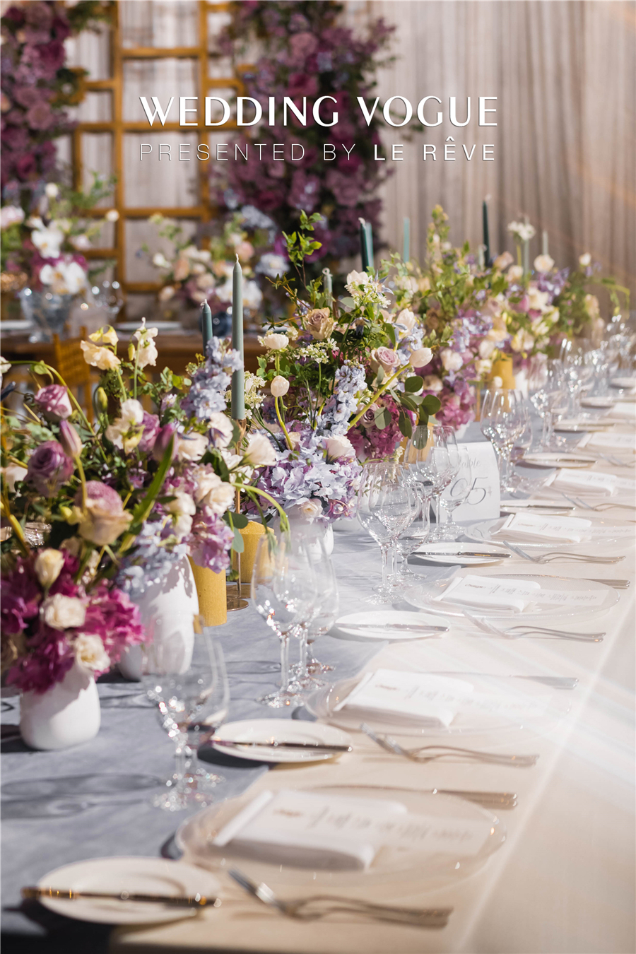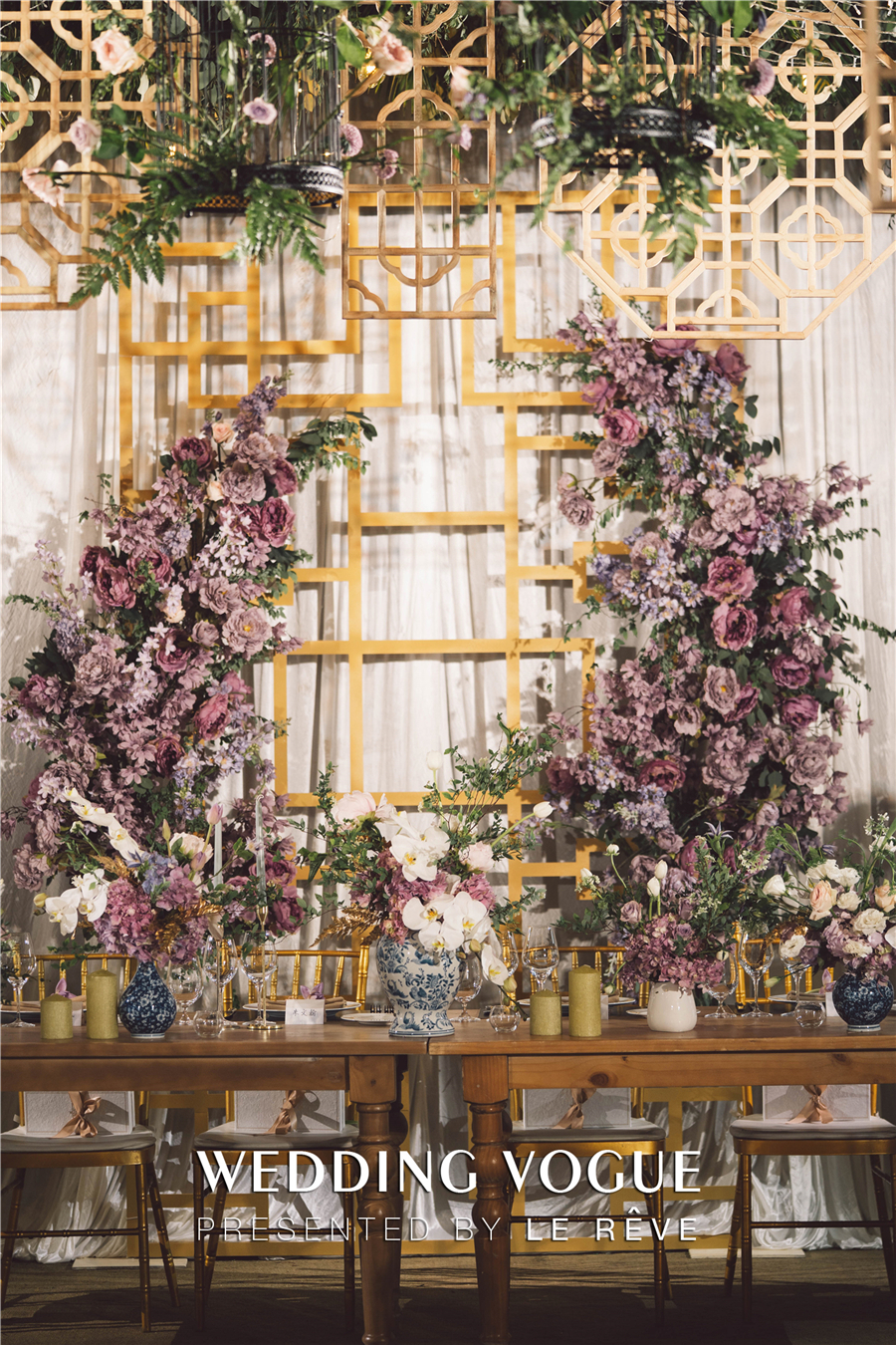 主桌背景,选择了偏中式的隔栅,再以蓬勃自然的紫色花艺与绿植做搭配,突破了中规中矩的气质,充满鲜活的生命力。