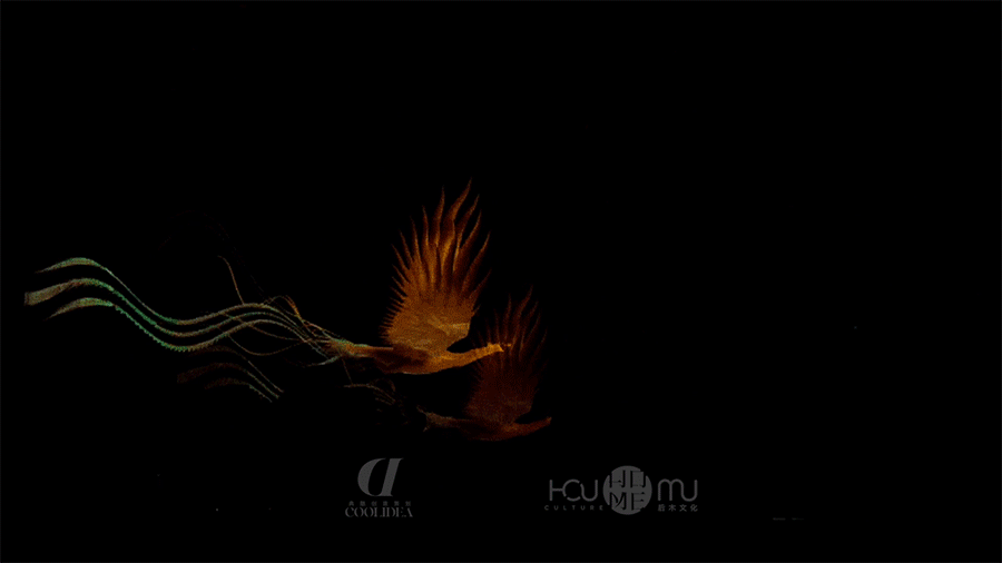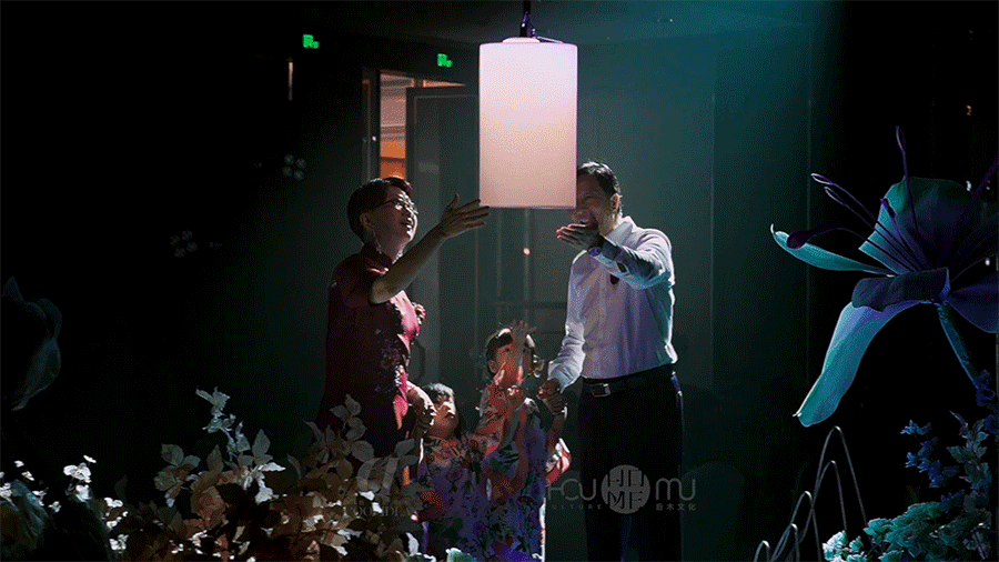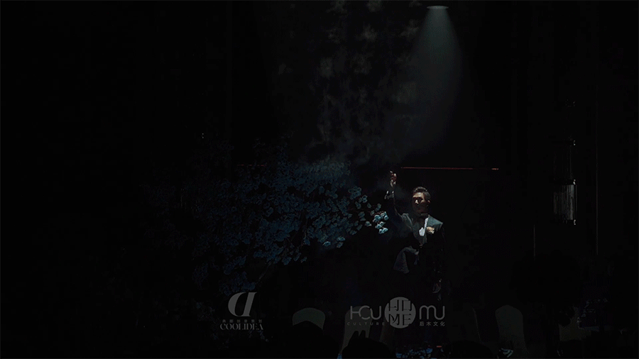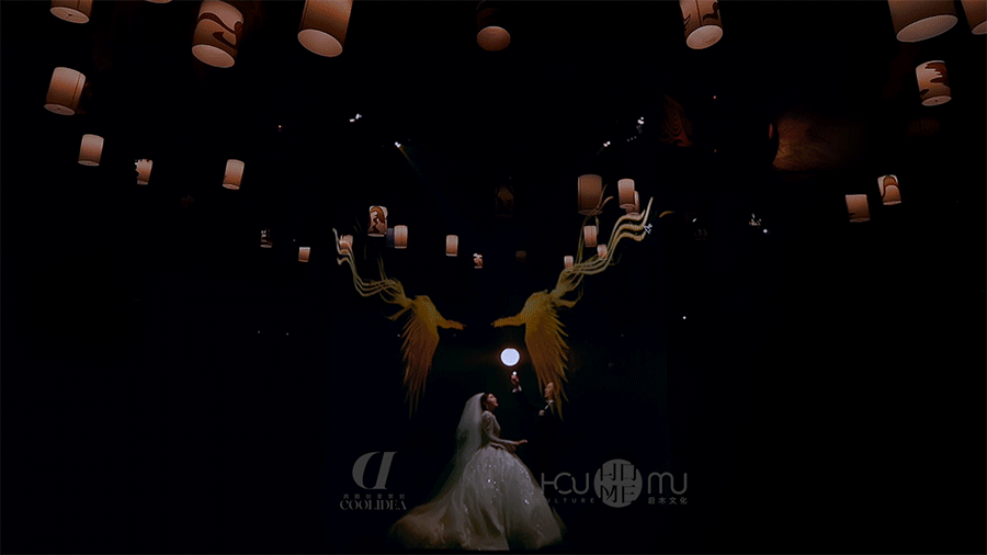 凤凰的剪影跟随者磅礴的鼓声,飞行环绕全场。此时新人在交接区舞台相会。承载着新人承诺的指环幻化成一颗夜明珠,在携手走过四季景象之后,由两只凤凰衔来交于新人的手中。