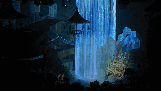 随后新郎登场,提笔挥毫,水雾迷蒙间出现主题诗句。所谓伊人,如诗如画。紧接着,新娘从主舞台水雾瀑布中出现。瞬间吸引现场来宾的注意。