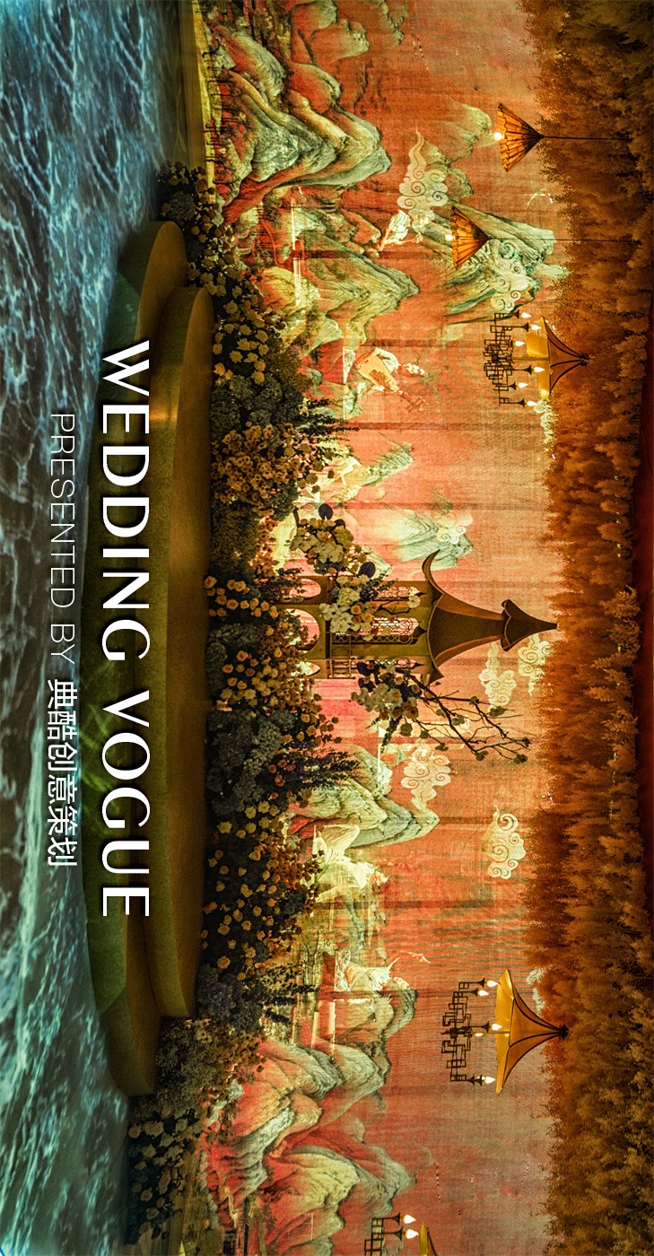 烟波浩渺的江河、层峦起伏的群山构成了一幅美妙的江南山水图。于是主舞台温柔的曲线,是河水的波浪,也是群山的起伏。巧借婚礼举办酒店—西子宾馆G20国宴厅的《西湖早春图》,似画卷的延伸,如景从画中来。更与曲线形T台设计相呼应,从视觉上延伸了端庄持重的中式韵味。