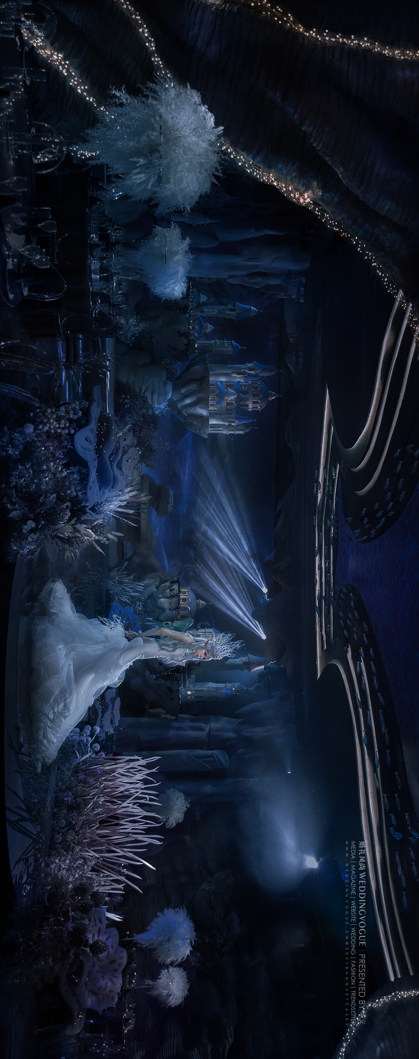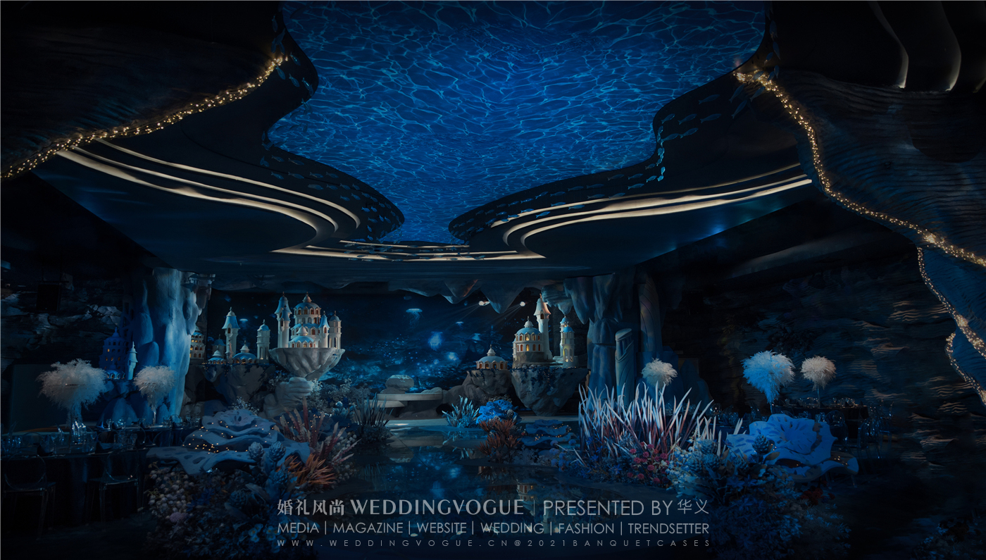 海洋主题婚礼,务必要沉浸式。因为还原的不是海上的风景,而是海底的风景。海上的风景人人都见过,沙滩、椰林、海面,想要海上的婚礼,直接去海岛就好。而想要海底的婚礼,只能通过设计师的想象来打造。